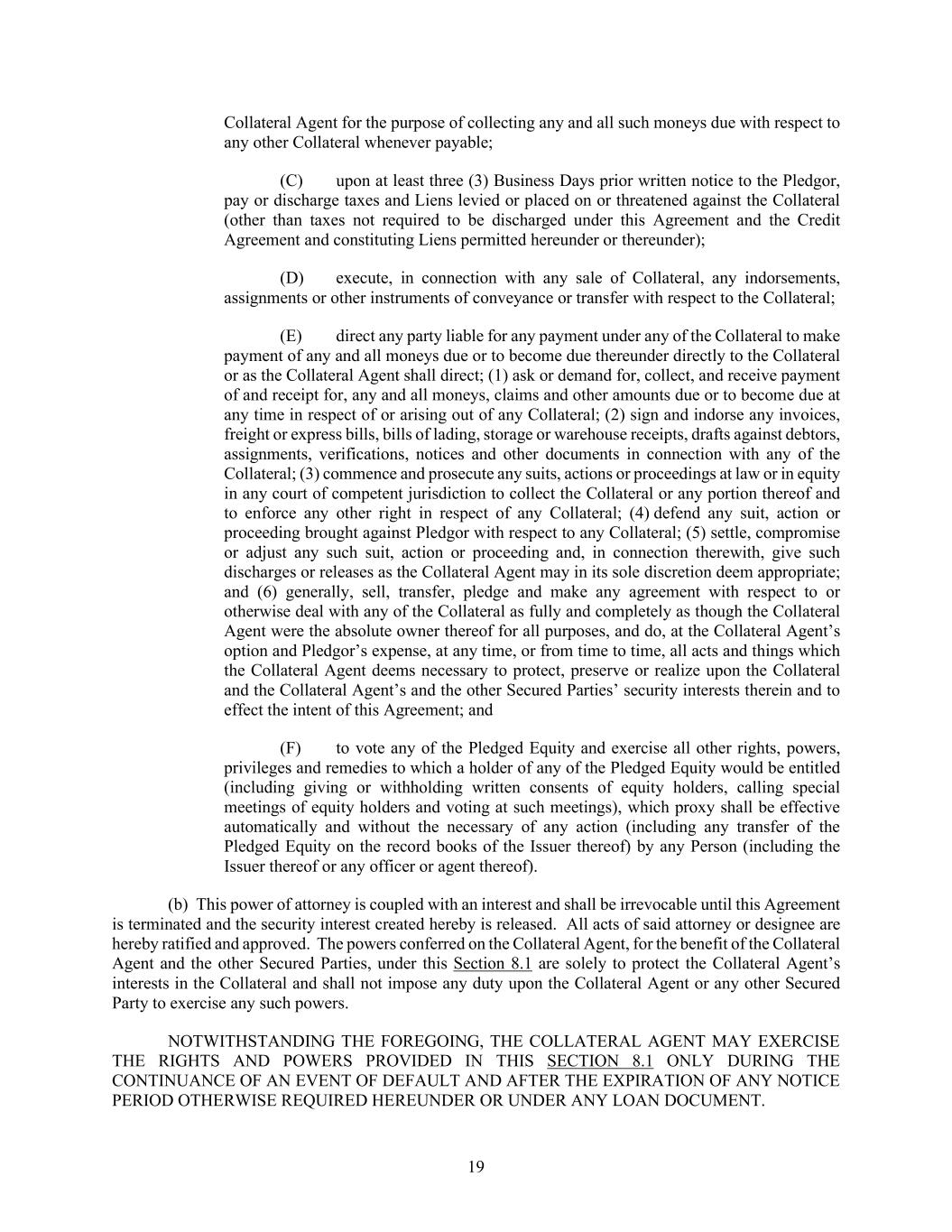 19 Collateral Agent for the purpose of collecting any and all such moneys due with respect to any other Collateral whenever payable; (C) upon at least three (3) Business Days prior written notice to the Pledgor, pay or discharge taxes and Liens levied or placed on or threatened against the Collateral (other than taxes not required to be discharged under this Agreement and the Credit Agreement and constituting Liens permitted hereunder or thereunder); (D) execute, in connection with any sale of Collateral, any indorsements, assignments or other instruments of conveyance or transfer with respect to the Collateral; (E) direct any party liable for any payment under any of the Collateral to make payment of any and all moneys due or to become due thereunder directly to the Collateral or as the Collateral Agent shall direct; (1) ask or demand for, collect, and receive payment of and receipt for, any and all moneys, claims and other amounts due or to become due at any time in respect of or arising out of any Collateral; (2) sign and indorse any invoices, freight or express bills, bills of lading, storage or warehouse receipts, drafts against debtors, assignments, verifications, notices and other documents in connection with any of the Collateral; (3) commence and prosecute any suits, actions or proceedings at law or in equity in any court of competent jurisdiction to collect the Collateral or any portion thereof and to enforce any other right in respect of any Collateral; (4) defend any suit, action or proceeding brought against Pledgor with respect to any Collateral; (5) settle, compromise or adjust any such suit, action or proceeding and, in connection therewith, give such discharges or releases as the Collateral Agent may in its sole discretion deem appropriate; and (6) generally, sell, transfer, pledge and make any agreement with respect to or otherwise deal with any of the Collateral as fully and completely as though the Collateral Agent were the absolute owner thereof for all purposes, and do, at the Collateral Agent’s option and Pledgor’s expense, at any time, or from time to time, all acts and things which the Collateral Agent deems necessary to protect, preserve or realize upon the Collateral and the Collateral Agent’s and the other Secured Parties’ security interests therein and to effect the intent of this Agreement; and (F) to vote any of the Pledged Equity and exercise all other rights, powers, privileges and remedies to which a holder of any of the Pledged Equity would be entitled (including giving or withholding written consents of equity holders, calling special meetings of equity holders and voting at such meetings), which proxy shall be effective automatically and without the necessary of any action (including any transfer of the Pledged Equity on the record books of the Issuer thereof) by any Person (including the Issuer thereof or any officer or agent thereof). (b) This power of attorney is coupled with an interest and shall be irrevocable until this Agreement is terminated and the security interest created hereby is released. All acts of said attorney or designee are hereby ratified and approved. The powers conferred on the Collateral Agent, for the benefit of the Collateral Agent and the other Secured Parties, under this Section 8.1 are solely to protect the Collateral Agent’s interests in the Collateral and shall not impose any duty upon the Collateral Agent or any other Secured Party to exercise any such powers. NOTWITHSTANDING THE FOREGOING, THE COLLATERAL AGENT MAY EXERCISE THE RIGHTS AND POWERS PROVIDED IN THIS SECTION 8.1 ONLY DURING THE CONTINUANCE OF AN EVENT OF DEFAULT AND AFTER THE EXPIRATION OF ANY NOTICE PERIOD OTHERWISE REQUIRED HEREUNDER OR UNDER ANY LOAN DOCUMENT.