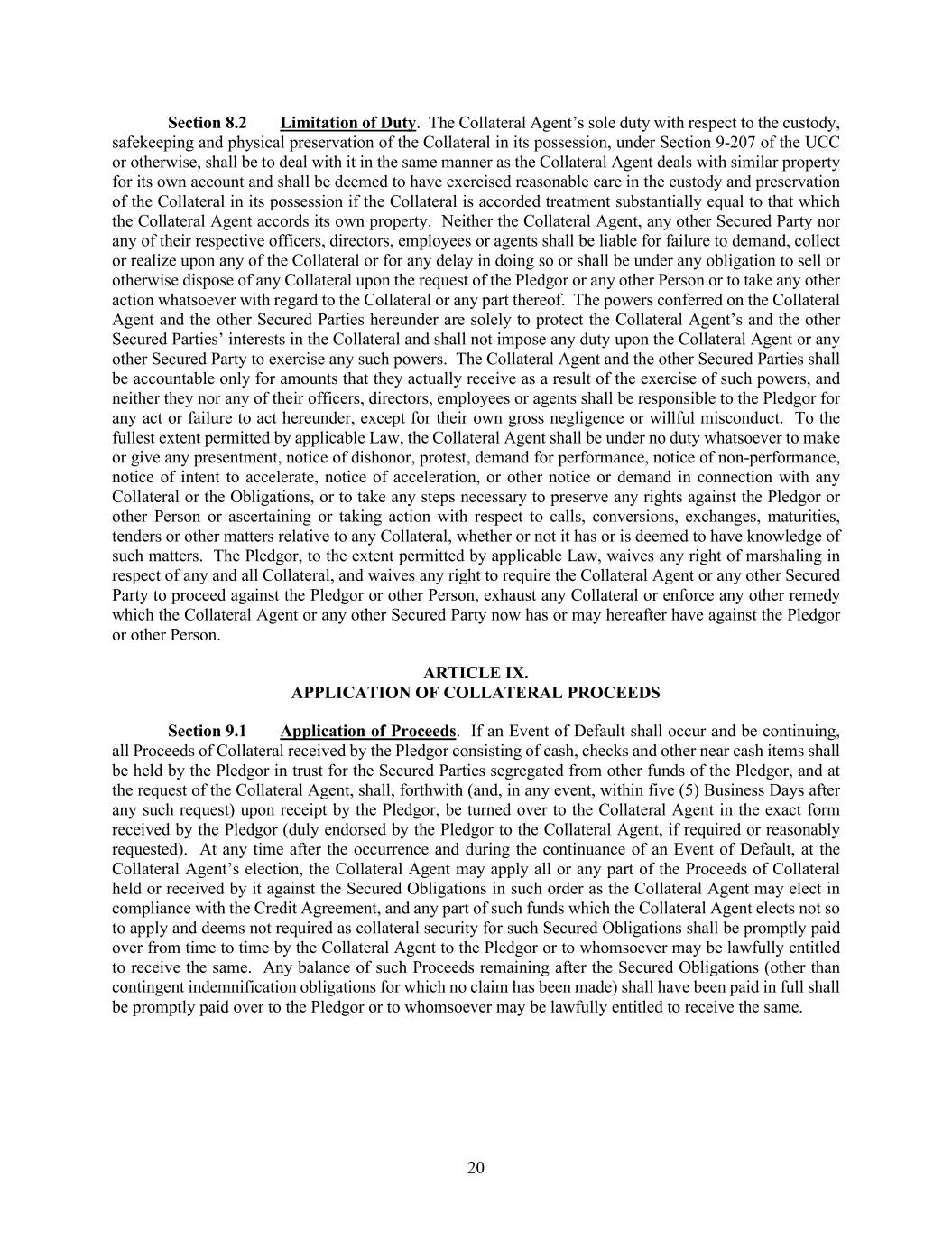 20 Section 8.2 Limitation of Duty. The Collateral Agent’s sole duty with respect to the custody, safekeeping and physical preservation of the Collateral in its possession, under Section 9-207 of the UCC or otherwise, shall be to deal with it in the same manner as the Collateral Agent deals with similar property for its own account and shall be deemed to have exercised reasonable care in the custody and preservation of the Collateral in its possession if the Collateral is accorded treatment substantially equal to that which the Collateral Agent accords its own property. Neither the Collateral Agent, any other Secured Party nor any of their respective officers, directors, employees or agents shall be liable for failure to demand, collect or realize upon any of the Collateral or for any delay in doing so or shall be under any obligation to sell or otherwise dispose of any Collateral upon the request of the Pledgor or any other Person or to take any other action whatsoever with regard to the Collateral or any part thereof. The powers conferred on the Collateral Agent and the other Secured Parties hereunder are solely to protect the Collateral Agent’s and the other Secured Parties’ interests in the Collateral and shall not impose any duty upon the Collateral Agent or any other Secured Party to exercise any such powers. The Collateral Agent and the other Secured Parties shall be accountable only for amounts that they actually receive as a result of the exercise of such powers, and neither they nor any of their officers, directors, employees or agents shall be responsible to the Pledgor for any act or failure to act hereunder, except for their own gross negligence or willful misconduct. To the fullest extent permitted by applicable Law, the Collateral Agent shall be under no duty whatsoever to make or give any presentment, notice of dishonor, protest, demand for performance, notice of non-performance, notice of intent to accelerate, notice of acceleration, or other notice or demand in connection with any Collateral or the Obligations, or to take any steps necessary to preserve any rights against the Pledgor or other Person or ascertaining or taking action with respect to calls, conversions, exchanges, maturities, tenders or other matters relative to any Collateral, whether or not it has or is deemed to have knowledge of such matters. The Pledgor, to the extent permitted by applicable Law, waives any right of marshaling in respect of any and all Collateral, and waives any right to require the Collateral Agent or any other Secured Party to proceed against the Pledgor or other Person, exhaust any Collateral or enforce any other remedy which the Collateral Agent or any other Secured Party now has or may hereafter have against the Pledgor or other Person. ARTICLE IX. APPLICATION OF COLLATERAL PROCEEDS Section 9.1 Application of Proceeds. If an Event of Default shall occur and be continuing, all Proceeds of Collateral received by the Pledgor consisting of cash, checks and other near cash items shall be held by the Pledgor in trust for the Secured Parties segregated from other funds of the Pledgor, and at the request of the Collateral Agent, shall, forthwith (and, in any event, within five (5) Business Days after any such request) upon receipt by the Pledgor, be turned over to the Collateral Agent in the exact form received by the Pledgor (duly endorsed by the Pledgor to the Collateral Agent, if required or reasonably requested). At any time after the occurrence and during the continuance of an Event of Default, at the Collateral Agent’s election, the Collateral Agent may apply all or any part of the Proceeds of Collateral held or received by it against the Secured Obligations in such order as the Collateral Agent may elect in compliance with the Credit Agreement, and any part of such funds which the Collateral Agent elects not so to apply and deems not required as collateral security for such Secured Obligations shall be promptly paid over from time to time by the Collateral Agent to the Pledgor or to whomsoever may be lawfully entitled to receive the same. Any balance of such Proceeds remaining after the Secured Obligations (other than contingent indemnification obligations for which no claim has been made) shall have been paid in full shall be promptly paid over to the Pledgor or to whomsoever may be lawfully entitled to receive the same.