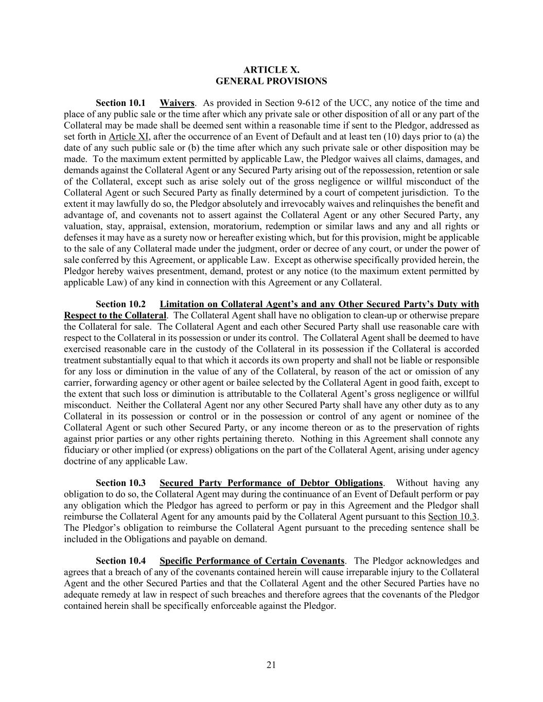 21 ARTICLE X. GENERAL PROVISIONS Section 10.1 Waivers. As provided in Section 9-612 of the UCC, any notice of the time and place of any public sale or the time after which any private sale or other disposition of all or any part of the Collateral may be made shall be deemed sent within a reasonable time if sent to the Pledgor, addressed as set forth in Article XI, after the occurrence of an Event of Default and at least ten (10) days prior to (a) the date of any such public sale or (b) the time after which any such private sale or other disposition may be made. To the maximum extent permitted by applicable Law, the Pledgor waives all claims, damages, and demands against the Collateral Agent or any Secured Party arising out of the repossession, retention or sale of the Collateral, except such as arise solely out of the gross negligence or willful misconduct of the Collateral Agent or such Secured Party as finally determined by a court of competent jurisdiction. To the extent it may lawfully do so, the Pledgor absolutely and irrevocably waives and relinquishes the benefit and advantage of, and covenants not to assert against the Collateral Agent or any other Secured Party, any valuation, stay, appraisal, extension, moratorium, redemption or similar laws and any and all rights or defenses it may have as a surety now or hereafter existing which, but for this provision, might be applicable to the sale of any Collateral made under the judgment, order or decree of any court, or under the power of sale conferred by this Agreement, or applicable Law. Except as otherwise specifically provided herein, the Pledgor hereby waives presentment, demand, protest or any notice (to the maximum extent permitted by applicable Law) of any kind in connection with this Agreement or any Collateral. Section 10.2 Limitation on Collateral Agent’s and any Other Secured Party’s Duty with Respect to the Collateral. The Collateral Agent shall have no obligation to clean-up or otherwise prepare the Collateral for sale. The Collateral Agent and each other Secured Party shall use reasonable care with respect to the Collateral in its possession or under its control. The Collateral Agent shall be deemed to have exercised reasonable care in the custody of the Collateral in its possession if the Collateral is accorded treatment substantially equal to that which it accords its own property and shall not be liable or responsible for any loss or diminution in the value of any of the Collateral, by reason of the act or omission of any carrier, forwarding agency or other agent or bailee selected by the Collateral Agent in good faith, except to the extent that such loss or diminution is attributable to the Collateral Agent’s gross negligence or willful misconduct. Neither the Collateral Agent nor any other Secured Party shall have any other duty as to any Collateral in its possession or control or in the possession or control of any agent or nominee of the Collateral Agent or such other Secured Party, or any income thereon or as to the preservation of rights against prior parties or any other rights pertaining thereto. Nothing in this Agreement shall connote any fiduciary or other implied (or express) obligations on the part of the Collateral Agent, arising under agency doctrine of any applicable Law. Section 10.3 Secured Party Performance of Debtor Obligations. Without having any obligation to do so, the Collateral Agent may during the continuance of an Event of Default perform or pay any obligation which the Pledgor has agreed to perform or pay in this Agreement and the Pledgor shall reimburse the Collateral Agent for any amounts paid by the Collateral Agent pursuant to this Section 10.3. The Pledgor’s obligation to reimburse the Collateral Agent pursuant to the preceding sentence shall be included in the Obligations and payable on demand. Section 10.4 Specific Performance of Certain Covenants. The Pledgor acknowledges and agrees that a breach of any of the covenants contained herein will cause irreparable injury to the Collateral Agent and the other Secured Parties and that the Collateral Agent and the other Secured Parties have no adequate remedy at law in respect of such breaches and therefore agrees that the covenants of the Pledgor contained herein shall be specifically enforceable against the Pledgor.