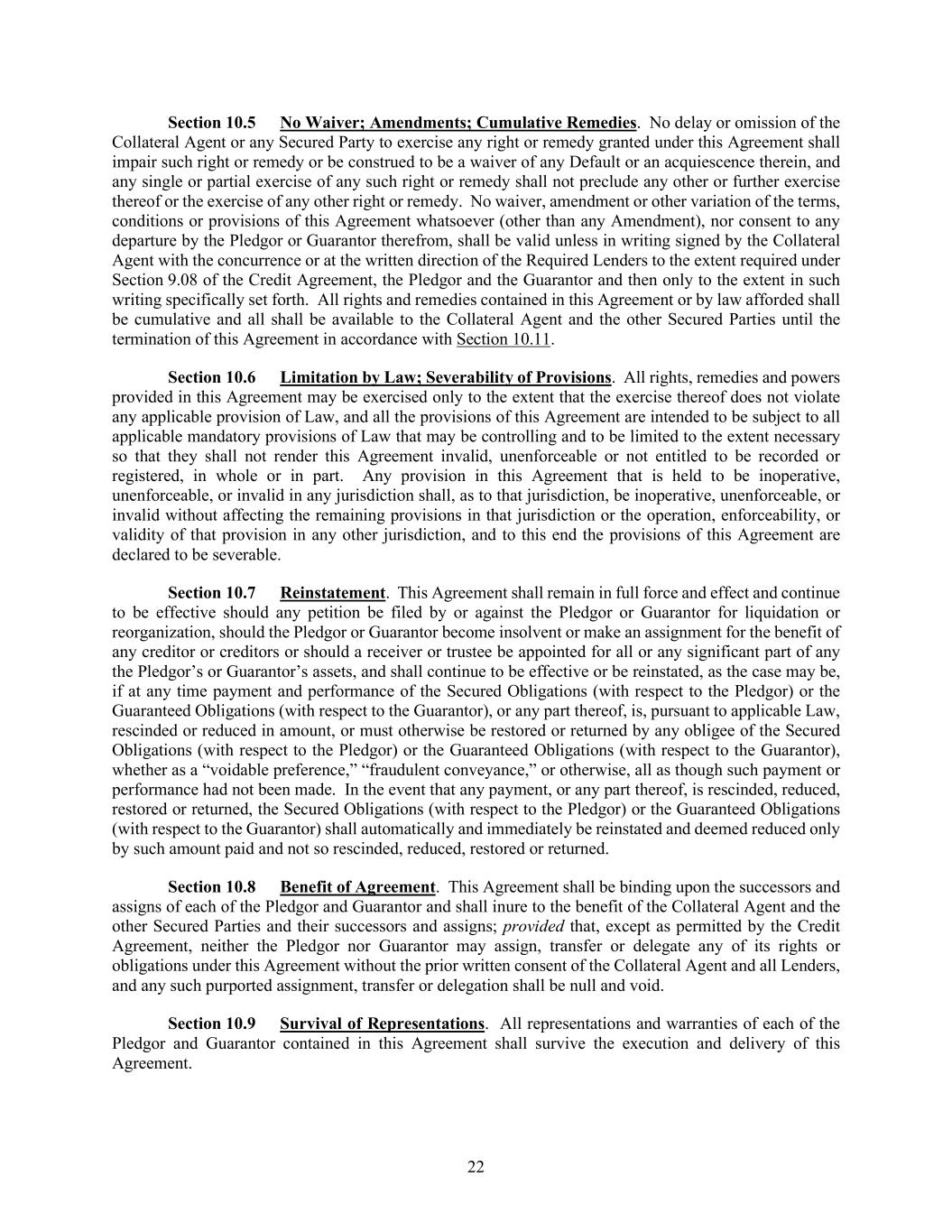 22 Section 10.5 No Waiver; Amendments; Cumulative Remedies. No delay or omission of the Collateral Agent or any Secured Party to exercise any right or remedy granted under this Agreement shall impair such right or remedy or be construed to be a waiver of any Default or an acquiescence therein, and any single or partial exercise of any such right or remedy shall not preclude any other or further exercise thereof or the exercise of any other right or remedy. No waiver, amendment or other variation of the terms, conditions or provisions of this Agreement whatsoever (other than any Amendment), nor consent to any departure by the Pledgor or Guarantor therefrom, shall be valid unless in writing signed by the Collateral Agent with the concurrence or at the written direction of the Required Lenders to the extent required under Section 9.08 of the Credit Agreement, the Pledgor and the Guarantor and then only to the extent in such writing specifically set forth. All rights and remedies contained in this Agreement or by law afforded shall be cumulative and all shall be available to the Collateral Agent and the other Secured Parties until the termination of this Agreement in accordance with Section 10.11. Section 10.6 Limitation by Law; Severability of Provisions. All rights, remedies and powers provided in this Agreement may be exercised only to the extent that the exercise thereof does not violate any applicable provision of Law, and all the provisions of this Agreement are intended to be subject to all applicable mandatory provisions of Law that may be controlling and to be limited to the extent necessary so that they shall not render this Agreement invalid, unenforceable or not entitled to be recorded or registered, in whole or in part. Any provision in this Agreement that is held to be inoperative, unenforceable, or invalid in any jurisdiction shall, as to that jurisdiction, be inoperative, unenforceable, or invalid without affecting the remaining provisions in that jurisdiction or the operation, enforceability, or validity of that provision in any other jurisdiction, and to this end the provisions of this Agreement are declared to be severable. Section 10.7 Reinstatement. This Agreement shall remain in full force and effect and continue to be effective should any petition be filed by or against the Pledgor or Guarantor for liquidation or reorganization, should the Pledgor or Guarantor become insolvent or make an assignment for the benefit of any creditor or creditors or should a receiver or trustee be appointed for all or any significant part of any the Pledgor’s or Guarantor’s assets, and shall continue to be effective or be reinstated, as the case may be, if at any time payment and performance of the Secured Obligations (with respect to the Pledgor) or the Guaranteed Obligations (with respect to the Guarantor), or any part thereof, is, pursuant to applicable Law, rescinded or reduced in amount, or must otherwise be restored or returned by any obligee of the Secured Obligations (with respect to the Pledgor) or the Guaranteed Obligations (with respect to the Guarantor), whether as a “voidable preference,” “fraudulent conveyance,” or otherwise, all as though such payment or performance had not been made. In the event that any payment, or any part thereof, is rescinded, reduced, restored or returned, the Secured Obligations (with respect to the Pledgor) or the Guaranteed Obligations (with respect to the Guarantor) shall automatically and immediately be reinstated and deemed reduced only by such amount paid and not so rescinded, reduced, restored or returned. Section 10.8 Benefit of Agreement. This Agreement shall be binding upon the successors and assigns of each of the Pledgor and Guarantor and shall inure to the benefit of the Collateral Agent and the other Secured Parties and their successors and assigns; provided that, except as permitted by the Credit Agreement, neither the Pledgor nor Guarantor may assign, transfer or delegate any of its rights or obligations under this Agreement without the prior written consent of the Collateral Agent and all Lenders, and any such purported assignment, transfer or delegation shall be null and void. Section 10.9 Survival of Representations. All representations and warranties of each of the Pledgor and Guarantor contained in this Agreement shall survive the execution and delivery of this Agreement.