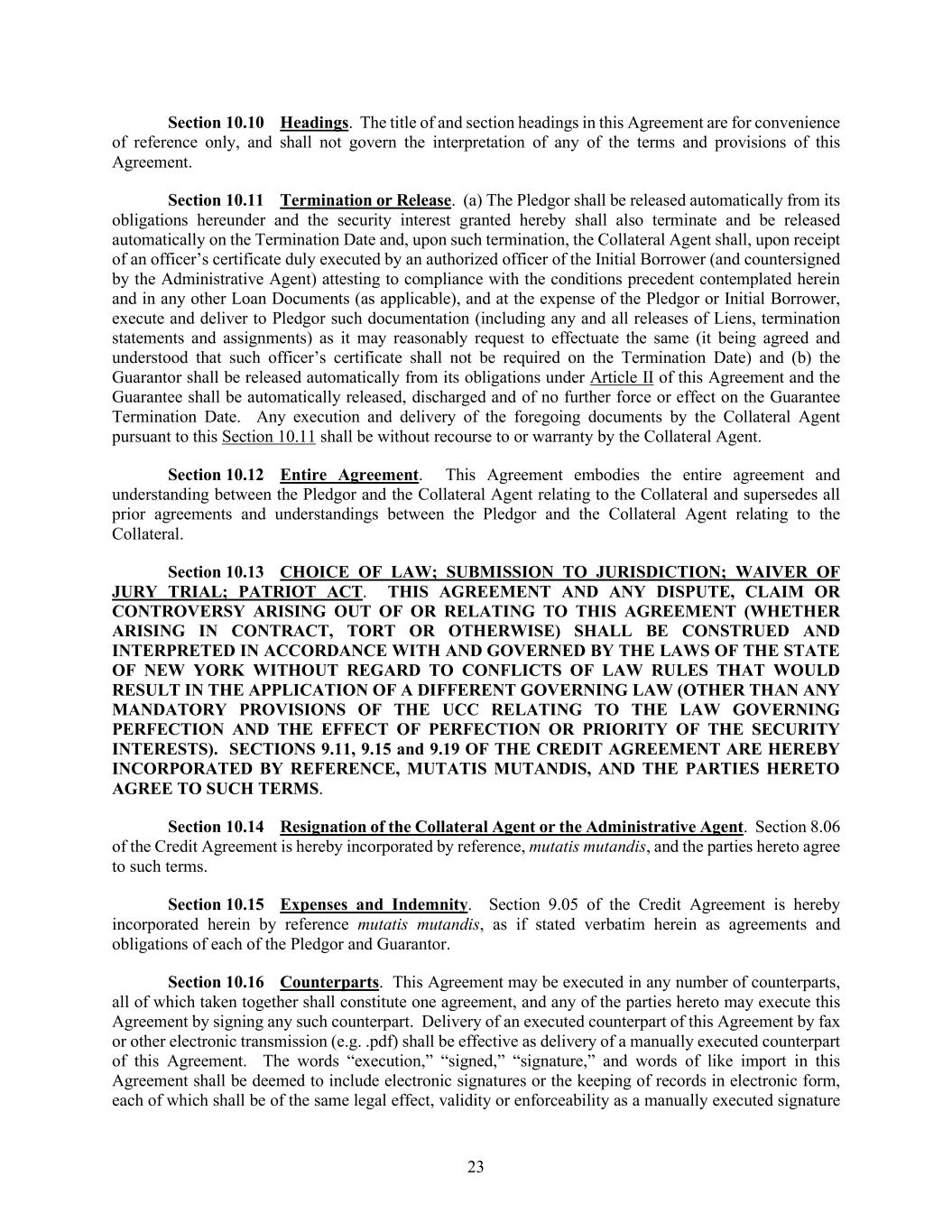 23 Section 10.10 Headings. The title of and section headings in this Agreement are for convenience of reference only, and shall not govern the interpretation of any of the terms and provisions of this Agreement. Section 10.11 Termination or Release. (a) The Pledgor shall be released automatically from its obligations hereunder and the security interest granted hereby shall also terminate and be released automatically on the Termination Date and, upon such termination, the Collateral Agent shall, upon receipt of an officer’s certificate duly executed by an authorized officer of the Initial Borrower (and countersigned by the Administrative Agent) attesting to compliance with the conditions precedent contemplated herein and in any other Loan Documents (as applicable), and at the expense of the Pledgor or Initial Borrower, execute and deliver to Pledgor such documentation (including any and all releases of Liens, termination statements and assignments) as it may reasonably request to effectuate the same (it being agreed and understood that such officer’s certificate shall not be required on the Termination Date) and (b) the Guarantor shall be released automatically from its obligations under Article II of this Agreement and the Guarantee shall be automatically released, discharged and of no further force or effect on the Guarantee Termination Date. Any execution and delivery of the foregoing documents by the Collateral Agent pursuant to this Section 10.11 shall be without recourse to or warranty by the Collateral Agent. Section 10.12 Entire Agreement. This Agreement embodies the entire agreement and understanding between the Pledgor and the Collateral Agent relating to the Collateral and supersedes all prior agreements and understandings between the Pledgor and the Collateral Agent relating to the Collateral. Section 10.13 CHOICE OF LAW; SUBMISSION TO JURISDICTION; WAIVER OF JURY TRIAL; PATRIOT ACT. THIS AGREEMENT AND ANY DISPUTE, CLAIM OR CONTROVERSY ARISING OUT OF OR RELATING TO THIS AGREEMENT (WHETHER ARISING IN CONTRACT, TORT OR OTHERWISE) SHALL BE CONSTRUED AND INTERPRETED IN ACCORDANCE WITH AND GOVERNED BY THE LAWS OF THE STATE OF NEW YORK WITHOUT REGARD TO CONFLICTS OF LAW RULES THAT WOULD RESULT IN THE APPLICATION OF A DIFFERENT GOVERNING LAW (OTHER THAN ANY MANDATORY PROVISIONS OF THE UCC RELATING TO THE LAW GOVERNING PERFECTION AND THE EFFECT OF PERFECTION OR PRIORITY OF THE SECURITY INTERESTS). SECTIONS 9.11, 9.15 and 9.19 OF THE CREDIT AGREEMENT ARE HEREBY INCORPORATED BY REFERENCE, MUTATIS MUTANDIS, AND THE PARTIES HERETO AGREE TO SUCH TERMS. Section 10.14 Resignation of the Collateral Agent or the Administrative Agent. Section 8.06 of the Credit Agreement is hereby incorporated by reference, mutatis mutandis, and the parties hereto agree to such terms. Section 10.15 Expenses and Indemnity. Section 9.05 of the Credit Agreement is hereby incorporated herein by reference mutatis mutandis, as if stated verbatim herein as agreements and obligations of each of the Pledgor and Guarantor. Section 10.16 Counterparts. This Agreement may be executed in any number of counterparts, all of which taken together shall constitute one agreement, and any of the parties hereto may execute this Agreement by signing any such counterpart. Delivery of an executed counterpart of this Agreement by fax or other electronic transmission (e.g. .pdf) shall be effective as delivery of a manually executed counterpart of this Agreement. The words “execution,” “signed,” “signature,” and words of like import in this Agreement shall be deemed to include electronic signatures or the keeping of records in electronic form, each of which shall be of the same legal effect, validity or enforceability as a manually executed signature
