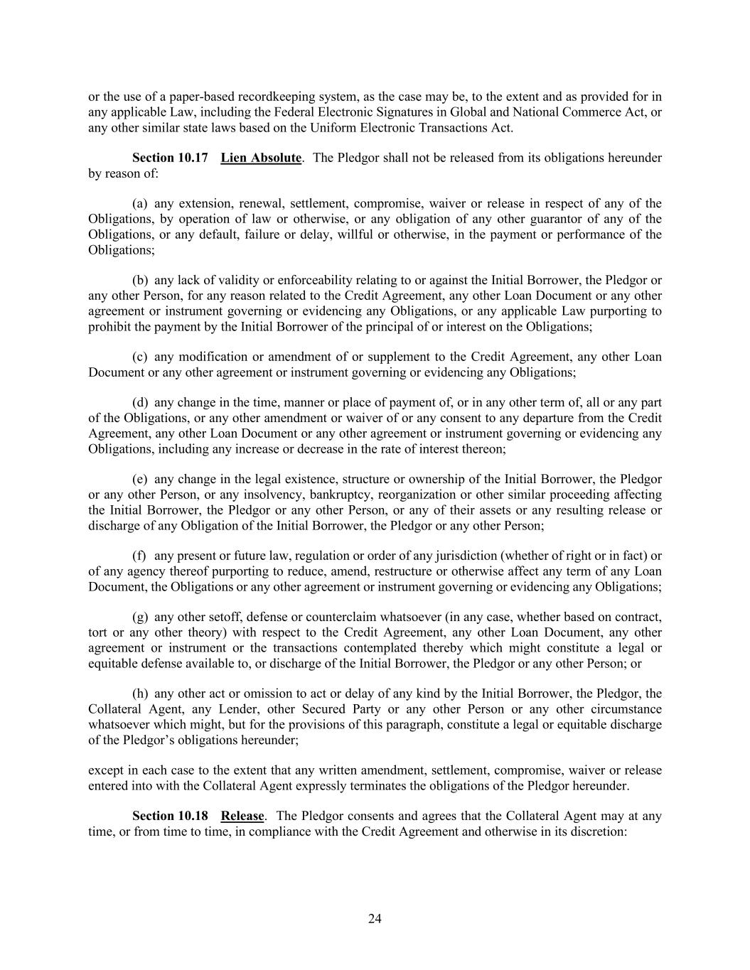 24 or the use of a paper-based recordkeeping system, as the case may be, to the extent and as provided for in any applicable Law, including the Federal Electronic Signatures in Global and National Commerce Act, or any other similar state laws based on the Uniform Electronic Transactions Act. Section 10.17 Lien Absolute. The Pledgor shall not be released from its obligations hereunder by reason of: (a) any extension, renewal, settlement, compromise, waiver or release in respect of any of the Obligations, by operation of law or otherwise, or any obligation of any other guarantor of any of the Obligations, or any default, failure or delay, willful or otherwise, in the payment or performance of the Obligations; (b) any lack of validity or enforceability relating to or against the Initial Borrower, the Pledgor or any other Person, for any reason related to the Credit Agreement, any other Loan Document or any other agreement or instrument governing or evidencing any Obligations, or any applicable Law purporting to prohibit the payment by the Initial Borrower of the principal of or interest on the Obligations; (c) any modification or amendment of or supplement to the Credit Agreement, any other Loan Document or any other agreement or instrument governing or evidencing any Obligations; (d) any change in the time, manner or place of payment of, or in any other term of, all or any part of the Obligations, or any other amendment or waiver of or any consent to any departure from the Credit Agreement, any other Loan Document or any other agreement or instrument governing or evidencing any Obligations, including any increase or decrease in the rate of interest thereon; (e) any change in the legal existence, structure or ownership of the Initial Borrower, the Pledgor or any other Person, or any insolvency, bankruptcy, reorganization or other similar proceeding affecting the Initial Borrower, the Pledgor or any other Person, or any of their assets or any resulting release or discharge of any Obligation of the Initial Borrower, the Pledgor or any other Person; (f) any present or future law, regulation or order of any jurisdiction (whether of right or in fact) or of any agency thereof purporting to reduce, amend, restructure or otherwise affect any term of any Loan Document, the Obligations or any other agreement or instrument governing or evidencing any Obligations; (g) any other setoff, defense or counterclaim whatsoever (in any case, whether based on contract, tort or any other theory) with respect to the Credit Agreement, any other Loan Document, any other agreement or instrument or the transactions contemplated thereby which might constitute a legal or equitable defense available to, or discharge of the Initial Borrower, the Pledgor or any other Person; or (h) any other act or omission to act or delay of any kind by the Initial Borrower, the Pledgor, the Collateral Agent, any Lender, other Secured Party or any other Person or any other circumstance whatsoever which might, but for the provisions of this paragraph, constitute a legal or equitable discharge of the Pledgor’s obligations hereunder; except in each case to the extent that any written amendment, settlement, compromise, waiver or release entered into with the Collateral Agent expressly terminates the obligations of the Pledgor hereunder. Section 10.18 Release. The Pledgor consents and agrees that the Collateral Agent may at any time, or from time to time, in compliance with the Credit Agreement and otherwise in its discretion: