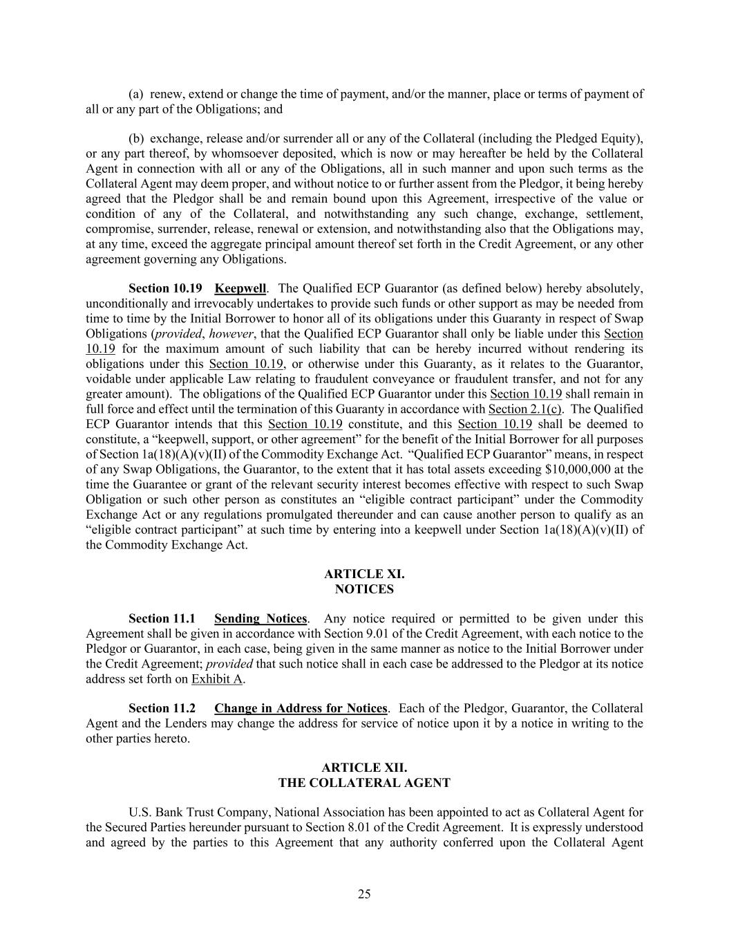 25 (a) renew, extend or change the time of payment, and/or the manner, place or terms of payment of all or any part of the Obligations; and (b) exchange, release and/or surrender all or any of the Collateral (including the Pledged Equity), or any part thereof, by whomsoever deposited, which is now or may hereafter be held by the Collateral Agent in connection with all or any of the Obligations, all in such manner and upon such terms as the Collateral Agent may deem proper, and without notice to or further assent from the Pledgor, it being hereby agreed that the Pledgor shall be and remain bound upon this Agreement, irrespective of the value or condition of any of the Collateral, and notwithstanding any such change, exchange, settlement, compromise, surrender, release, renewal or extension, and notwithstanding also that the Obligations may, at any time, exceed the aggregate principal amount thereof set forth in the Credit Agreement, or any other agreement governing any Obligations. Section 10.19 Keepwell. The Qualified ECP Guarantor (as defined below) hereby absolutely, unconditionally and irrevocably undertakes to provide such funds or other support as may be needed from time to time by the Initial Borrower to honor all of its obligations under this Guaranty in respect of Swap Obligations (provided, however, that the Qualified ECP Guarantor shall only be liable under this Section 10.19 for the maximum amount of such liability that can be hereby incurred without rendering its obligations under this Section 10.19, or otherwise under this Guaranty, as it relates to the Guarantor, voidable under applicable Law relating to fraudulent conveyance or fraudulent transfer, and not for any greater amount). The obligations of the Qualified ECP Guarantor under this Section 10.19 shall remain in full force and effect until the termination of this Guaranty in accordance with Section 2.1(c). The Qualified ECP Guarantor intends that this Section 10.19 constitute, and this Section 10.19 shall be deemed to constitute, a “keepwell, support, or other agreement” for the benefit of the Initial Borrower for all purposes of Section 1a(18)(A)(v)(II) of the Commodity Exchange Act. “Qualified ECP Guarantor” means, in respect of any Swap Obligations, the Guarantor, to the extent that it has total assets exceeding $10,000,000 at the time the Guarantee or grant of the relevant security interest becomes effective with respect to such Swap Obligation or such other person as constitutes an “eligible contract participant” under the Commodity Exchange Act or any regulations promulgated thereunder and can cause another person to qualify as an “eligible contract participant” at such time by entering into a keepwell under Section 1a(18)(A)(v)(II) of the Commodity Exchange Act. ARTICLE XI. NOTICES Section 11.1 Sending Notices. Any notice required or permitted to be given under this Agreement shall be given in accordance with Section 9.01 of the Credit Agreement, with each notice to the Pledgor or Guarantor, in each case, being given in the same manner as notice to the Initial Borrower under the Credit Agreement; provided that such notice shall in each case be addressed to the Pledgor at its notice address set forth on Exhibit A. Section 11.2 Change in Address for Notices. Each of the Pledgor, Guarantor, the Collateral Agent and the Lenders may change the address for service of notice upon it by a notice in writing to the other parties hereto. ARTICLE XII. THE COLLATERAL AGENT U.S. Bank Trust Company, National Association has been appointed to act as Collateral Agent for the Secured Parties hereunder pursuant to Section 8.01 of the Credit Agreement. It is expressly understood and agreed by the parties to this Agreement that any authority conferred upon the Collateral Agent
