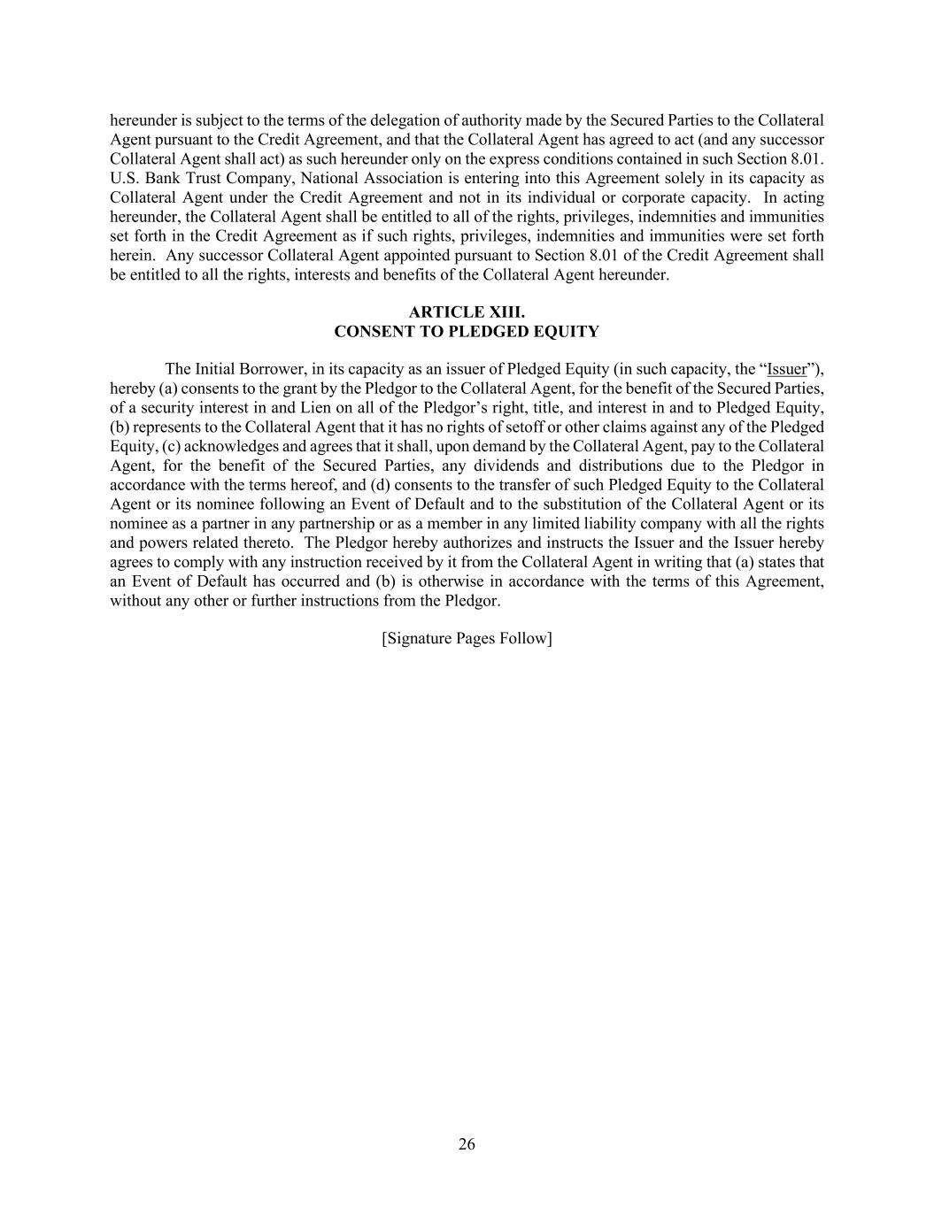 26 hereunder is subject to the terms of the delegation of authority made by the Secured Parties to the Collateral Agent pursuant to the Credit Agreement, and that the Collateral Agent has agreed to act (and any successor Collateral Agent shall act) as such hereunder only on the express conditions contained in such Section 8.01. U.S. Bank Trust Company, National Association is entering into this Agreement solely in its capacity as Collateral Agent under the Credit Agreement and not in its individual or corporate capacity. In acting hereunder, the Collateral Agent shall be entitled to all of the rights, privileges, indemnities and immunities set forth in the Credit Agreement as if such rights, privileges, indemnities and immunities were set forth herein. Any successor Collateral Agent appointed pursuant to Section 8.01 of the Credit Agreement shall be entitled to all the rights, interests and benefits of the Collateral Agent hereunder. ARTICLE XIII. CONSENT TO PLEDGED EQUITY The Initial Borrower, in its capacity as an issuer of Pledged Equity (in such capacity, the “Issuer”), hereby (a) consents to the grant by the Pledgor to the Collateral Agent, for the benefit of the Secured Parties, of a security interest in and Lien on all of the Pledgor’s right, title, and interest in and to Pledged Equity, (b) represents to the Collateral Agent that it has no rights of setoff or other claims against any of the Pledged Equity, (c) acknowledges and agrees that it shall, upon demand by the Collateral Agent, pay to the Collateral Agent, for the benefit of the Secured Parties, any dividends and distributions due to the Pledgor in accordance with the terms hereof, and (d) consents to the transfer of such Pledged Equity to the Collateral Agent or its nominee following an Event of Default and to the substitution of the Collateral Agent or its nominee as a partner in any partnership or as a member in any limited liability company with all the rights and powers related thereto. The Pledgor hereby authorizes and instructs the Issuer and the Issuer hereby agrees to comply with any instruction received by it from the Collateral Agent in writing that (a) states that an Event of Default has occurred and (b) is otherwise in accordance with the terms of this Agreement, without any other or further instructions from the Pledgor. [Signature Pages Follow]