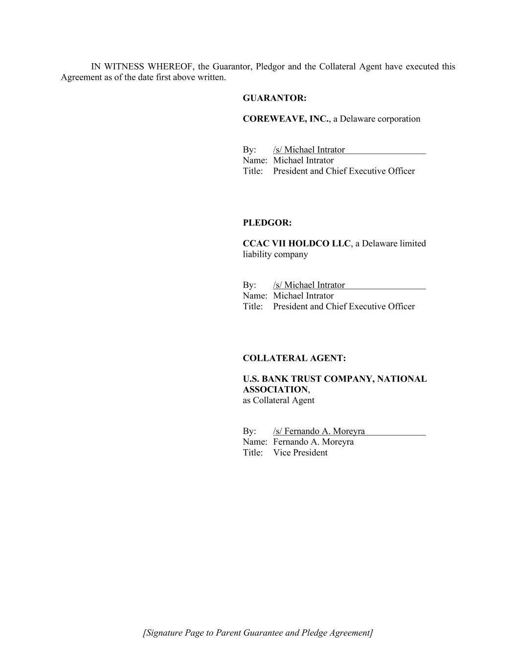[Signature Page to Parent Guarantee and Pledge Agreement] IN WITNESS WHEREOF, the Guarantor, Pledgor and the Collateral Agent have executed this Agreement as of the date first above written. GUARANTOR: COREWEAVE, INC., a Delaware corporation By: /s/ Michael Intrator Name: Michael Intrator Title: President and Chief Executive Officer PLEDGOR: CCAC VII HOLDCO LLC, a Delaware limited liability company By: /s/ Michael Intrator Name: Michael Intrator Title: President and Chief Executive Officer COLLATERAL AGENT: U.S. BANK TRUST COMPANY, NATIONAL ASSOCIATION, as Collateral Agent By: /s/ Fernando A. Moreyra Name: Fernando A. Moreyra Title: Vice President