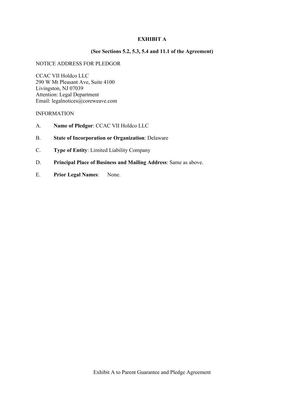 Exhibit A to Parent Guarantee and Pledge Agreement EXHIBIT A (See Sections 5.2, 5.3, 5.4 and 11.1 of the Agreement) NOTICE ADDRESS FOR PLEDGOR CCAC VII Holdco LLC 290 W Mt Pleasant Ave, Suite 4100 Livingston, NJ 07039 Attention: Legal Department Email: legalnotices@coreweave.com INFORMATION A. Name of Pledgor: CCAC VII Holdco LLC B. State of Incorporation or Organization: Delaware C. Type of Entity: Limited Liability Company D. Principal Place of Business and Mailing Address: Same as above. E. Prior Legal Names: None.