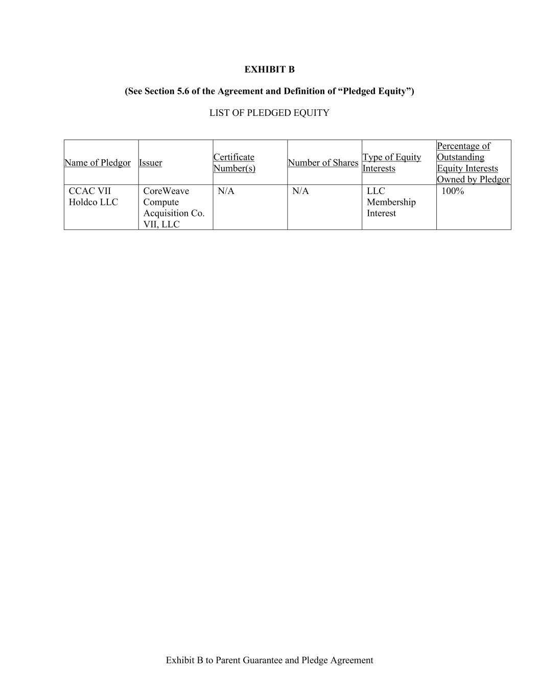 Exhibit B to Parent Guarantee and Pledge Agreement EXHIBIT B (See Section 5.6 of the Agreement and Definition of “Pledged Equity”) LIST OF PLEDGED EQUITY Name of Pledgor Issuer Certificate Number(s) Number of Shares Type of Equity Interests Percentage of Outstanding Equity Interests Owned by Pledgor CCAC VII Holdco LLC CoreWeave Compute Acquisition Co. VII, LLC N/A N/A LLC Membership Interest 100%