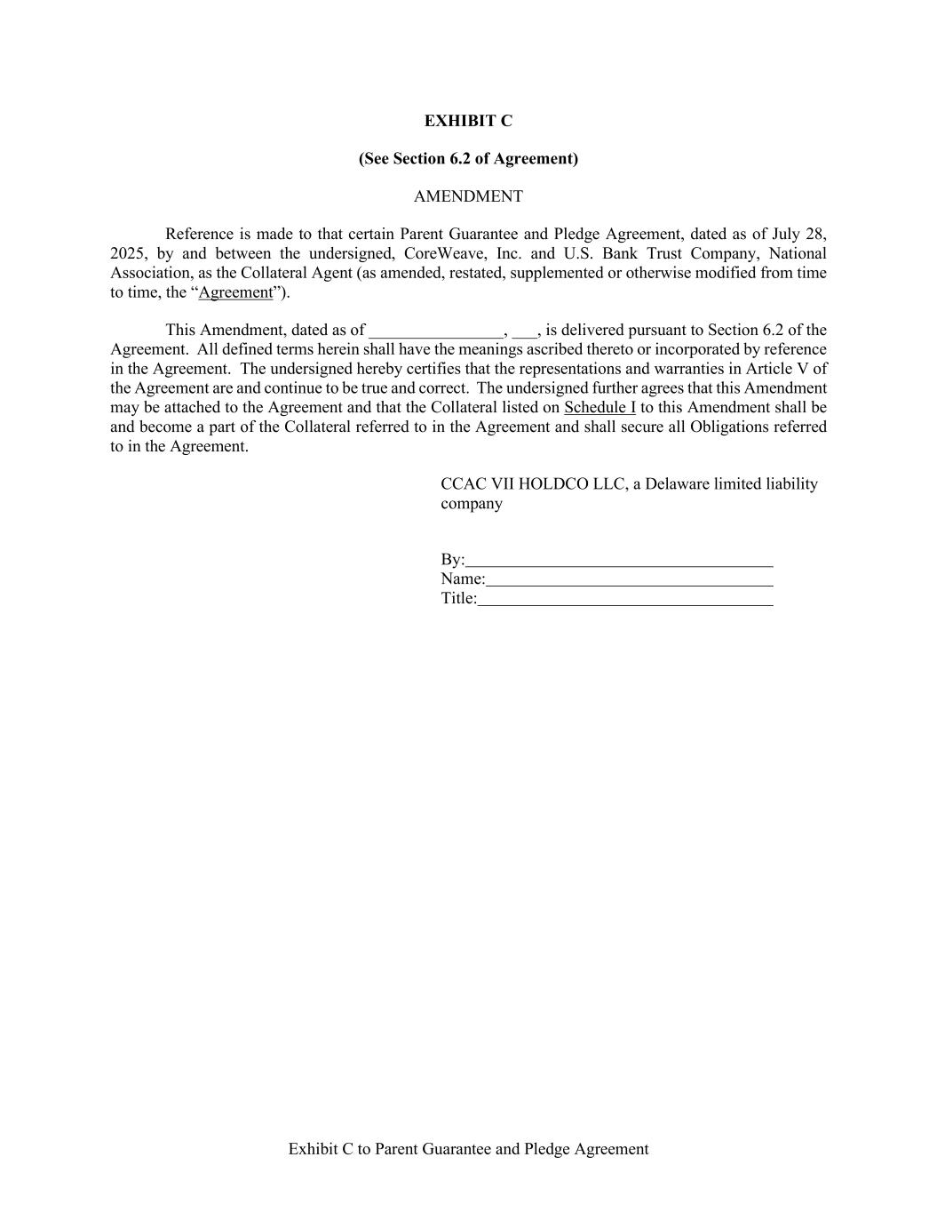 Exhibit C to Parent Guarantee and Pledge Agreement EXHIBIT C (See Section 6.2 of Agreement) AMENDMENT Reference is made to that certain Parent Guarantee and Pledge Agreement, dated as of July 28, 2025, by and between the undersigned, CoreWeave, Inc. and U.S. Bank Trust Company, National Association, as the Collateral Agent (as amended, restated, supplemented or otherwise modified from time to time, the “Agreement”). This Amendment, dated as of ________________, ___, is delivered pursuant to Section 6.2 of the Agreement. All defined terms herein shall have the meanings ascribed thereto or incorporated by reference in the Agreement. The undersigned hereby certifies that the representations and warranties in Article V of the Agreement are and continue to be true and correct. The undersigned further agrees that this Amendment may be attached to the Agreement and that the Collateral listed on Schedule I to this Amendment shall be and become a part of the Collateral referred to in the Agreement and shall secure all Obligations referred to in the Agreement. CCAC VII HOLDCO LLC, a Delaware limited liability company By: Name: Title: