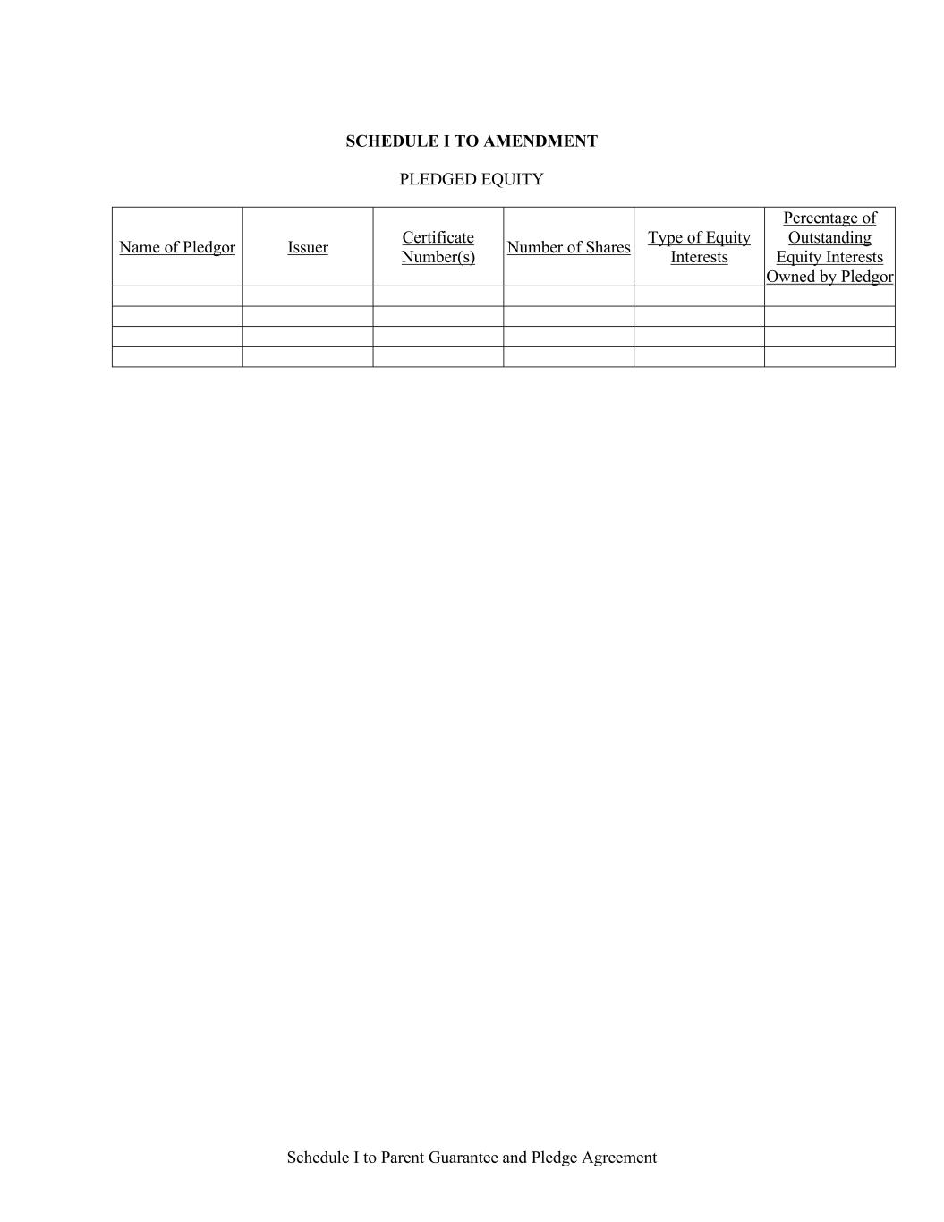 Schedule I to Parent Guarantee and Pledge Agreement SCHEDULE I TO AMENDMENT PLEDGED EQUITY Name of Pledgor Issuer Certificate Number(s) Number of Shares Type of Equity Interests Percentage of Outstanding Equity Interests Owned by Pledgor