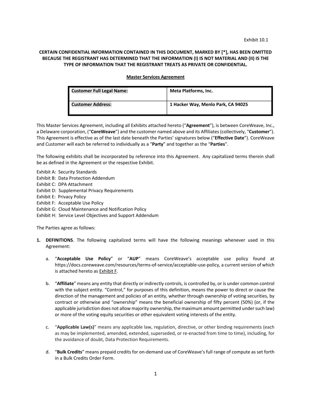 1 Exhibit 10.1 CERTAIN CONFIDENTIAL INFORMATION CONTAINED IN THIS DOCUMENT, MARKED BY [*], HAS BEEN OMITTED BECAUSE THE REGISTRANT HAS DETERMINED THAT THE INFORMATION (I) IS NOT MATERIAL AND (II) IS THE TYPE OF INFORMATION THAT THE REGISTRANT TREATS AS PRIVATE OR CONFIDENTIAL. Master Services Agreement Customer Full Legal Name: Meta Platforms, Inc. Customer Address: 1 Hacker Way, Menlo Park, CA 94025 This Master Services Agreement, including all Exhibits attached hereto (“Agreement”), is between CoreWeave, Inc., a Delaware corporation, (“CoreWeave”) and the customer named above and its Affiliates (collectively, “Customer”). This Agreement is effective as of the last date beneath the Parties’ signatures below (“Effective Date”). CoreWeave and Customer will each be referred to individually as a “Party” and together as the “Parties”. The following exhibits shall be incorporated by reference into this Agreement. Any capitalized terms therein shall be as defined in the Agreement or the respective Exhibit. Exhibit A: Security Standards Exhibit B: Data Protection Addendum Exhibit C: DPA Attachment Exhibit D: Supplemental Privacy Requirements Exhibit E: Privacy Policy Exhibit F: Acceptable Use Policy Exhibit G: Cloud Maintenance and Notification Policy Exhibit H: Service Level Objectives and Support Addendum The Parties agree as follows: 1. DEFINITIONS. The following capitalized terms will have the following meanings whenever used in this Agreement: a. “Acceptable Use Policy” or “AUP” means CoreWeave’s acceptable use policy found at https://docs.coreweave.com/resources/terms-of-service/acceptable-use-policy, a current version of which is attached hereto as Exhibit F. b. “Affiliate” means any entity that directly or indirectly controls, is controlled by, or is under common control with the subject entity. “Control,” for purposes of this definition, means the power to direct or cause the direction of the management and policies of an entity, whether through ownership of voting securities, by contract or otherwise and “ownership” means the beneficial ownership of fifty percent (50%) (or, if the applicable jurisdiction does not allow majority ownership, the maximum amount permitted under such law) or more of the voting equity securities or other equivalent voting interests of the entity. c. “Applicable Law(s)” means any applicable law, regulation, directive, or other binding requirements (each as may be implemented, amended, extended, superseded, or re-enacted from time to time), including, for the avoidance of doubt, Data Protection Requirements. d. “Bulk Credits” means prepaid credits for on-demand use of CoreWeave’s full range of compute as set forth in a Bulk Credits Order Form.