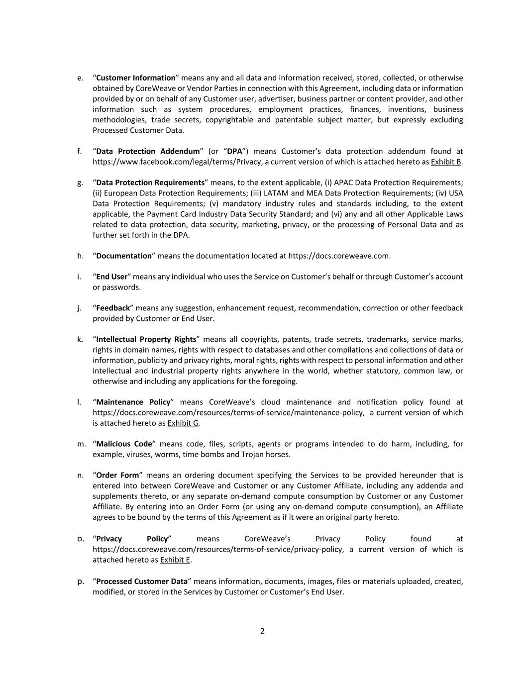 2 e. “Customer Information” means any and all data and information received, stored, collected, or otherwise obtained by CoreWeave or Vendor Parties in connection with this Agreement, including data or information provided by or on behalf of any Customer user, advertiser, business partner or content provider, and other information such as system procedures, employment practices, finances, inventions, business methodologies, trade secrets, copyrightable and patentable subject matter, but expressly excluding Processed Customer Data. f. “Data Protection Addendum” (or “DPA”) means Customer’s data protection addendum found at https://www.facebook.com/legal/terms/Privacy, a current version of which is attached hereto as Exhibit B. g. “Data Protection Requirements” means, to the extent applicable, (i) APAC Data Protection Requirements; (ii) European Data Protection Requirements; (iii) LATAM and MEA Data Protection Requirements; (iv) USA Data Protection Requirements; (v) mandatory industry rules and standards including, to the extent applicable, the Payment Card Industry Data Security Standard; and (vi) any and all other Applicable Laws related to data protection, data security, marketing, privacy, or the processing of Personal Data and as further set forth in the DPA. h. “Documentation” means the documentation located at https://docs.coreweave.com. i. “End User” means any individual who uses the Service on Customer’s behalf or through Customer’s account or passwords. j. “Feedback” means any suggestion, enhancement request, recommendation, correction or other feedback provided by Customer or End User. k. “Intellectual Property Rights” means all copyrights, patents, trade secrets, trademarks, service marks, rights in domain names, rights with respect to databases and other compilations and collections of data or information, publicity and privacy rights, moral rights, rights with respect to personal information and other intellectual and industrial property rights anywhere in the world, whether statutory, common law, or otherwise and including any applications for the foregoing. l. “Maintenance Policy” means CoreWeave’s cloud maintenance and notification policy found at https://docs.coreweave.com/resources/terms-of-service/maintenance-policy, a current version of which is attached hereto as Exhibit G. m. “Malicious Code” means code, files, scripts, agents or programs intended to do harm, including, for example, viruses, worms, time bombs and Trojan horses. n. “Order Form” means an ordering document specifying the Services to be provided hereunder that is entered into between CoreWeave and Customer or any Customer Affiliate, including any addenda and supplements thereto, or any separate on-demand compute consumption by Customer or any Customer Affiliate. By entering into an Order Form (or using any on-demand compute consumption), an Affiliate agrees to be bound by the terms of this Agreement as if it were an original party hereto. o. “Privacy Policy” means CoreWeave’s Privacy Policy found at https://docs.coreweave.com/resources/terms-of-service/privacy-policy, a current version of which is attached hereto as Exhibit E. p. “Processed Customer Data” means information, documents, images, files or materials uploaded, created, modified, or stored in the Services by Customer or Customer’s End User.