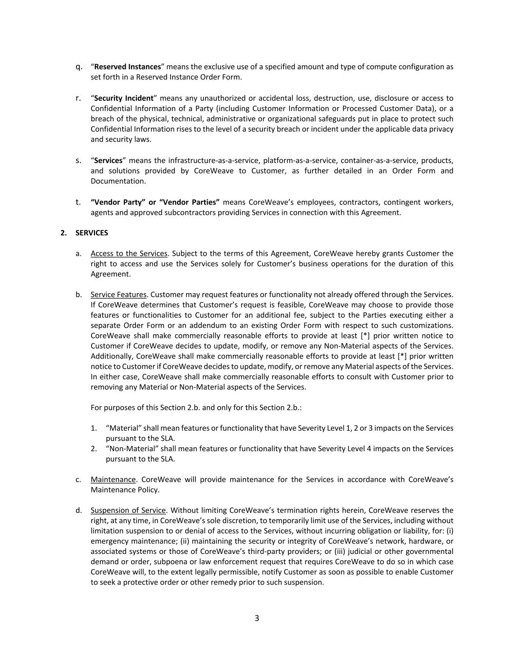 3 q. “Reserved Instances” means the exclusive use of a specified amount and type of compute configuration as set forth in a Reserved Instance Order Form. r. “Security Incident” means any unauthorized or accidental loss, destruction, use, disclosure or access to Confidential Information of a Party (including Customer Information or Processed Customer Data), or a breach of the physical, technical, administrative or organizational safeguards put in place to protect such Confidential Information rises to the level of a security breach or incident under the applicable data privacy and security laws. s. “Services” means the infrastructure-as-a-service, platform-as-a-service, container-as-a-service, products, and solutions provided by CoreWeave to Customer, as further detailed in an Order Form and Documentation. t. “Vendor Party” or “Vendor Parties” means CoreWeave’s employees, contractors, contingent workers, agents and approved subcontractors providing Services in connection with this Agreement. 2. SERVICES a. Access to the Services. Subject to the terms of this Agreement, CoreWeave hereby grants Customer the right to access and use the Services solely for Customer’s business operations for the duration of this Agreement. b. Service Features. Customer may request features or functionality not already offered through the Services. If CoreWeave determines that Customer’s request is feasible, CoreWeave may choose to provide those features or functionalities to Customer for an additional fee, subject to the Parties executing either a separate Order Form or an addendum to an existing Order Form with respect to such customizations. CoreWeave shall make commercially reasonable efforts to provide at least [*] prior written notice to Customer if CoreWeave decides to update, modify, or remove any Non-Material aspects of the Services. Additionally, CoreWeave shall make commercially reasonable efforts to provide at least [*] prior written notice to Customer if CoreWeave decides to update, modify, or remove any Material aspects of the Services. In either case, CoreWeave shall make commercially reasonable efforts to consult with Customer prior to removing any Material or Non-Material aspects of the Services. For purposes of this Section 2.b. and only for this Section 2.b.: 1. “Material” shall mean features or functionality that have Severity Level 1, 2 or 3 impacts on the Services pursuant to the SLA. 2. “Non-Material” shall mean features or functionality that have Severity Level 4 impacts on the Services pursuant to the SLA. c. Maintenance. CoreWeave will provide maintenance for the Services in accordance with CoreWeave’s Maintenance Policy. d. Suspension of Service. Without limiting CoreWeave’s termination rights herein, CoreWeave reserves the right, at any time, in CoreWeave’s sole discretion, to temporarily limit use of the Services, including without limitation suspension to or denial of access to the Services, without incurring obligation or liability, for: (i) emergency maintenance; (ii) maintaining the security or integrity of CoreWeave’s network, hardware, or associated systems or those of CoreWeave’s third-party providers; or (iii) judicial or other governmental demand or order, subpoena or law enforcement request that requires CoreWeave to do so in which case CoreWeave will, to the extent legally permissible, notify Customer as soon as possible to enable Customer to seek a protective order or other remedy prior to such suspension.