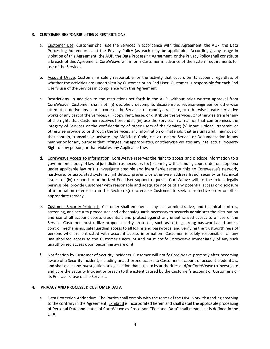 4 3. CUSTOMER RESPONSIBILITIES & RESTRICTIONS a. Customer Use. Customer shall use the Services in accordance with this Agreement, the AUP, the Data Processing Addendum, and the Privacy Policy (as each may be applicable). Accordingly, any usage in violation of this Agreement, the AUP, the Data Processing Agreement, or the Privacy Policy shall constitute a breach of this Agreement. CoreWeave will inform Customer in advance of the system requirements for use of the Services. b. Account Usage. Customer is solely responsible for the activity that occurs on its account regardless of whether the activities are undertaken by Customer or an End User. Customer is responsible for each End User’s use of the Services in compliance with this Agreement. c. Restrictions. In addition to the restrictions set forth in the AUP, without prior written approval from CoreWeave, Customer shall not: (i) decipher, decompile, disassemble, reverse-engineer or otherwise attempt to derive any source code of the Services; (ii) modify, translate, or otherwise create derivative works of any part of the Services; (iii) copy, rent, lease, or distribute the Services, or otherwise transfer any of the rights that Customer receives hereunder; (iv) use the Services in a manner that compromises the integrity of Services or the confidentiality of other users of the Service; (v) input, upload, transmit, or otherwise provide to or through the Services, any information or materials that are unlawful, injurious or that contain, transmit, or activate any Malicious Code; or (vi) use the Service or Documentation in any manner or for any purpose that infringes, misappropriates, or otherwise violates any Intellectual Property Right of any person, or that violates any Applicable Law. d. CoreWeave Access to Information. CoreWeave reserves the right to access and disclose information to a governmental body of lawful jurisdiction as necessary to: (i) comply with a binding court order or subpoena under applicable law or (ii) investigate credible and identifiable security risks to Coreweave’s network, hardware, or associated systems; (iii) detect, prevent, or otherwise address fraud, security or technical issues; or (iv) respond to authorized End User support requests. CoreWeave will, to the extent legally permissible, provide Customer with reasonable and adequate notice of any potential access or disclosure of information referred to in this Section 3(d) to enable Customer to seek a protective order or other appropriate remedy. e. Customer Security Protocols. Customer shall employ all physical, administrative, and technical controls, screening, and security procedures and other safeguards necessary to securely administer the distribution and use of all account access credentials and protect against any unauthorized access to or use of the Service. Customer must utilize proper security protocols, such as setting strong passwords and access control mechanisms, safeguarding access to all logins and passwords, and verifying the trustworthiness of persons who are entrusted with account access information. Customer is solely responsible for any unauthorized access to the Customer’s account and must notify CoreWeave immediately of any such unauthorized access upon becoming aware of it. f. Notification by Customer of Security Incidents. Customer will notify CoreWeave promptly after becoming aware of a Security Incident, including unauthorized access to Customer’s account or account credentials, and shall aid in any investigation or legal action that is taken by authorities and/or CoreWeave to investigate and cure the Security Incident or breach to the extent caused by the Customer’s account or Customer’s or its End Users’ use of the Services. 4. PRIVACY AND PROCESSED CUSTOMER DATA a. Data Protection Addendum. The Parties shall comply with the terms of the DPA. Notwithstanding anything to the contrary in the Agreement, Exhibit B is incorporated herein and shall detail the applicable processing of Personal Data and status of CoreWeave as Processor. “Personal Data” shall mean as it is defined in the DPA.