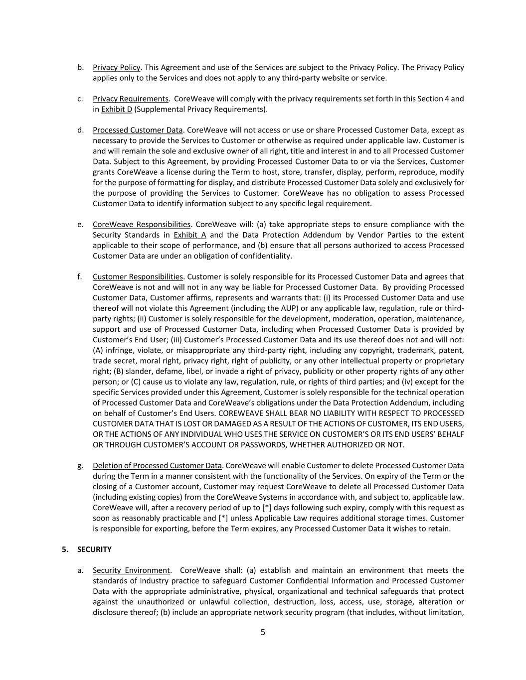 5 b. Privacy Policy. This Agreement and use of the Services are subject to the Privacy Policy. The Privacy Policy applies only to the Services and does not apply to any third-party website or service. c. Privacy Requirements. CoreWeave will comply with the privacy requirements set forth in this Section 4 and in Exhibit D (Supplemental Privacy Requirements). d. Processed Customer Data. CoreWeave will not access or use or share Processed Customer Data, except as necessary to provide the Services to Customer or otherwise as required under applicable law. Customer is and will remain the sole and exclusive owner of all right, title and interest in and to all Processed Customer Data. Subject to this Agreement, by providing Processed Customer Data to or via the Services, Customer grants CoreWeave a license during the Term to host, store, transfer, display, perform, reproduce, modify for the purpose of formatting for display, and distribute Processed Customer Data solely and exclusively for the purpose of providing the Services to Customer. CoreWeave has no obligation to assess Processed Customer Data to identify information subject to any specific legal requirement. e. CoreWeave Responsibilities. CoreWeave will: (a) take appropriate steps to ensure compliance with the Security Standards in Exhibit A and the Data Protection Addendum by Vendor Parties to the extent applicable to their scope of performance, and (b) ensure that all persons authorized to access Processed Customer Data are under an obligation of confidentiality. f. Customer Responsibilities. Customer is solely responsible for its Processed Customer Data and agrees that CoreWeave is not and will not in any way be liable for Processed Customer Data. By providing Processed Customer Data, Customer affirms, represents and warrants that: (i) its Processed Customer Data and use thereof will not violate this Agreement (including the AUP) or any applicable law, regulation, rule or third- party rights; (ii) Customer is solely responsible for the development, moderation, operation, maintenance, support and use of Processed Customer Data, including when Processed Customer Data is provided by Customer’s End User; (iii) Customer’s Processed Customer Data and its use thereof does not and will not: (A) infringe, violate, or misappropriate any third-party right, including any copyright, trademark, patent, trade secret, moral right, privacy right, right of publicity, or any other intellectual property or proprietary right; (B) slander, defame, libel, or invade a right of privacy, publicity or other property rights of any other person; or (C) cause us to violate any law, regulation, rule, or rights of third parties; and (iv) except for the specific Services provided under this Agreement, Customer is solely responsible for the technical operation of Processed Customer Data and CoreWeave’s obligations under the Data Protection Addendum, including on behalf of Customer’s End Users. COREWEAVE SHALL BEAR NO LIABILITY WITH RESPECT TO PROCESSED CUSTOMER DATA THAT IS LOST OR DAMAGED AS A RESULT OF THE ACTIONS OF CUSTOMER, ITS END USERS, OR THE ACTIONS OF ANY INDIVIDUAL WHO USES THE SERVICE ON CUSTOMER’S OR ITS END USERS’ BEHALF OR THROUGH CUSTOMER’S ACCOUNT OR PASSWORDS, WHETHER AUTHORIZED OR NOT. g. Deletion of Processed Customer Data. CoreWeave will enable Customer to delete Processed Customer Data during the Term in a manner consistent with the functionality of the Services. On expiry of the Term or the closing of a Customer account, Customer may request CoreWeave to delete all Processed Customer Data (including existing copies) from the CoreWeave Systems in accordance with, and subject to, applicable law. CoreWeave will, after a recovery period of up to [*] days following such expiry, comply with this request as soon as reasonably practicable and [*] unless Applicable Law requires additional storage times. Customer is responsible for exporting, before the Term expires, any Processed Customer Data it wishes to retain. 5. SECURITY a. Security Environment. CoreWeave shall: (a) establish and maintain an environment that meets the standards of industry practice to safeguard Customer Confidential Information and Processed Customer Data with the appropriate administrative, physical, organizational and technical safeguards that protect against the unauthorized or unlawful collection, destruction, loss, access, use, storage, alteration or disclosure thereof; (b) include an appropriate network security program (that includes, without limitation,