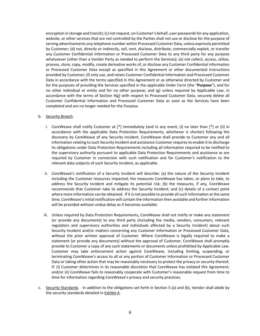 6 encryption in storage and transit); (c) not request, on Customer’s behalf, user passwords for any application, website, or other services that are not controlled by the Parties shall not use or disclose for the purpose of serving advertisements any telephone number within Processed Customer Data, unless expressly permitted by Customer; (d) not, directly or indirectly, sell, rent, disclose, distribute, commercially exploit, or transfer any Customer Confidential Information or Processed Customer Data to any third party for any purpose whatsoever (other than a Vendor Party as needed to perform the Services); (e) not collect, access, utilize, process, store, copy, modify, create derivative works of, or disclose any Customer Confidential Information or Processed Customer Data except as specified in this Agreement or other documented instructions provided by Customer; (f) only use, and retain Customer Confidential Information and Processed Customer Data in accordance with the terms specified in this Agreement or as otherwise directed by Customer and for the purposes of providing the Services specified in the applicable Order Form (the “Purpose”), and for no other individual or entity and for no other purpose; and (g) unless required by Applicable Law, in accordance with the terms of Section 4(g) with respect to Processed Customer Data, securely delete all Customer Confidential Information and Processed Customer Data as soon as the Services have been completed and are no longer needed for the Purpose. b. Security Breach. i. CoreWeave shall notify Customer at [*] immediately (and in any event, (i) no later than [*] or (ii) in accordance with the applicable Data Protection Requirements, whichever is shorter) following the discovery by CoreWeave of any Security Incident. CoreWeave shall provide to Customer any and all information relating to such Security Incident and assistance Customer requires to enable it to discharge its obligations under Data Protection Requirements including all information required to be notified to the supervisory authority pursuant to applicable Data Protection Requirements and assistance as are required by Customer in connection with such notification and for Customer’s notification to the relevant data subjects of such Security Incident, as applicable. ii. CoreWeave’s notification of a Security Incident will describe: (a) the nature of the Security Incident including the Customer resources impacted; the measures CoreWeave has taken, or plans to take, to address the Security Incident and mitigate its potential risk; (b) the measures, if any, CoreWeave recommends that Customer take to address the Security Incident; and (c) details of a contact point where more information can be obtained. If it is not possible to provide all such information at the same time, CoreWeave’s initial notification will contain the information then available and further information will be provided without undue delay as it becomes available. iii. Unless required by Data Protection Requirements, CoreWeave shall not notify or make any statement (or provide any documents) to any third party (including the media, vendors, consumers, relevant regulators and supervisory authorities and individuals affected by a Security Incident) about such Security Incident and/or matters concerning any Customer Information or Processed Customer Data, without the prior written approval of Customer. Where CoreWeave is legally required to make a statement (or provide any documents) without the approval of Customer, CoreWeave shall promptly provide to Customer a copy of any such statements or documents unless prohibited by Applicable Law. Customer may take enforcement action against CoreWeave, including limiting, suspending, or terminating CoreWeave’s access to all or any portion of Customer Information or Processed Customer Data or taking other action that may be reasonably necessary to protect the privacy or security thereof, if: (i) Customer determines in its reasonable discretion that CoreWeave has violated this Agreement; and/or (ii) CoreWeave fails to reasonably cooperate with Customer’s reasonable request from time to time for information regarding CoreWeave’s privacy and security practices. c. Security Standards. In addition to the obligations set forth in Section 5 (a) and (b), Vendor shall abide by the security standards detailed in Exhibit A.