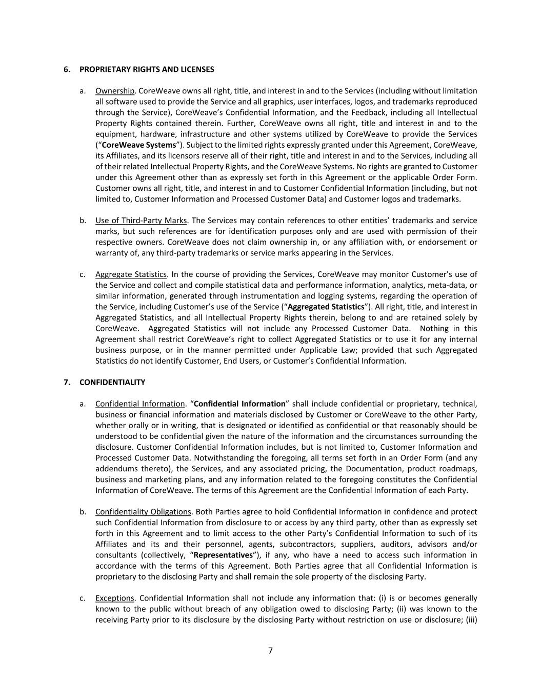 7 6. PROPRIETARY RIGHTS AND LICENSES a. Ownership. CoreWeave owns all right, title, and interest in and to the Services (including without limitation all software used to provide the Service and all graphics, user interfaces, logos, and trademarks reproduced through the Service), CoreWeave’s Confidential Information, and the Feedback, including all Intellectual Property Rights contained therein. Further, CoreWeave owns all right, title and interest in and to the equipment, hardware, infrastructure and other systems utilized by CoreWeave to provide the Services (“CoreWeave Systems”). Subject to the limited rights expressly granted under this Agreement, CoreWeave, its Affiliates, and its licensors reserve all of their right, title and interest in and to the Services, including all of their related Intellectual Property Rights, and the CoreWeave Systems. No rights are granted to Customer under this Agreement other than as expressly set forth in this Agreement or the applicable Order Form. Customer owns all right, title, and interest in and to Customer Confidential Information (including, but not limited to, Customer Information and Processed Customer Data) and Customer logos and trademarks. b. Use of Third-Party Marks. The Services may contain references to other entities’ trademarks and service marks, but such references are for identification purposes only and are used with permission of their respective owners. CoreWeave does not claim ownership in, or any affiliation with, or endorsement or warranty of, any third-party trademarks or service marks appearing in the Services. c. Aggregate Statistics. In the course of providing the Services, CoreWeave may monitor Customer’s use of the Service and collect and compile statistical data and performance information, analytics, meta-data, or similar information, generated through instrumentation and logging systems, regarding the operation of the Service, including Customer’s use of the Service (“Aggregated Statistics”). All right, title, and interest in Aggregated Statistics, and all Intellectual Property Rights therein, belong to and are retained solely by CoreWeave. Aggregated Statistics will not include any Processed Customer Data. Nothing in this Agreement shall restrict CoreWeave’s right to collect Aggregated Statistics or to use it for any internal business purpose, or in the manner permitted under Applicable Law; provided that such Aggregated Statistics do not identify Customer, End Users, or Customer’s Confidential Information. 7. CONFIDENTIALITY a. Confidential Information. “Confidential Information” shall include confidential or proprietary, technical, business or financial information and materials disclosed by Customer or CoreWeave to the other Party, whether orally or in writing, that is designated or identified as confidential or that reasonably should be understood to be confidential given the nature of the information and the circumstances surrounding the disclosure. Customer Confidential Information includes, but is not limited to, Customer Information and Processed Customer Data. Notwithstanding the foregoing, all terms set forth in an Order Form (and any addendums thereto), the Services, and any associated pricing, the Documentation, product roadmaps, business and marketing plans, and any information related to the foregoing constitutes the Confidential Information of CoreWeave. The terms of this Agreement are the Confidential Information of each Party. b. Confidentiality Obligations. Both Parties agree to hold Confidential Information in confidence and protect such Confidential Information from disclosure to or access by any third party, other than as expressly set forth in this Agreement and to limit access to the other Party’s Confidential Information to such of its Affiliates and its and their personnel, agents, subcontractors, suppliers, auditors, advisors and/or consultants (collectively, “Representatives”), if any, who have a need to access such information in accordance with the terms of this Agreement. Both Parties agree that all Confidential Information is proprietary to the disclosing Party and shall remain the sole property of the disclosing Party. c. Exceptions. Confidential Information shall not include any information that: (i) is or becomes generally known to the public without breach of any obligation owed to disclosing Party; (ii) was known to the receiving Party prior to its disclosure by the disclosing Party without restriction on use or disclosure; (iii)
