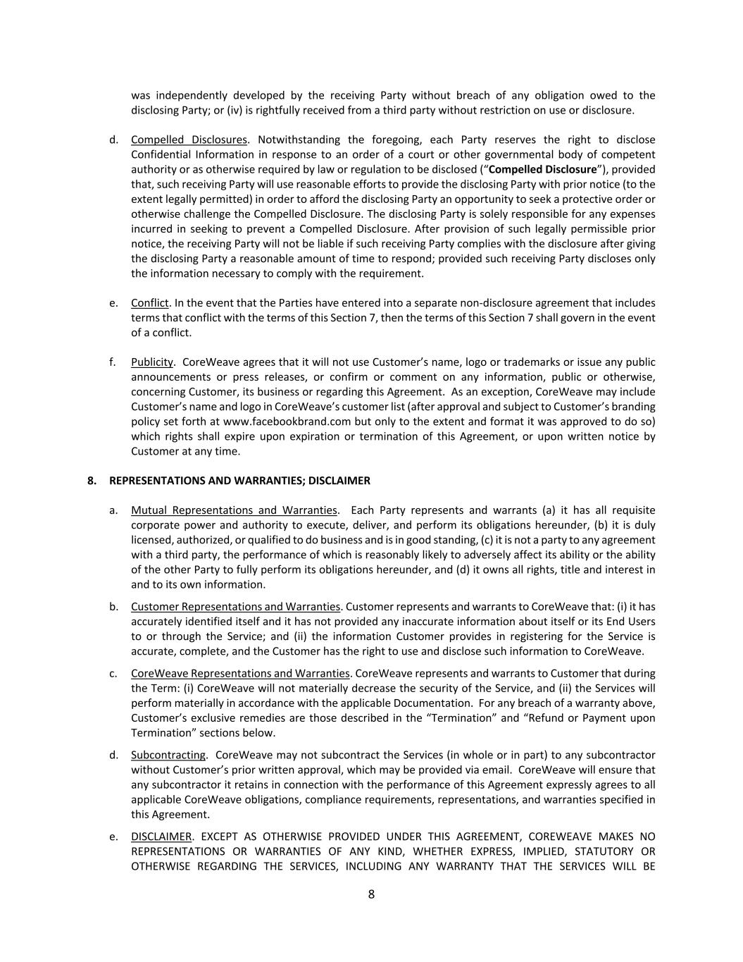 8 was independently developed by the receiving Party without breach of any obligation owed to the disclosing Party; or (iv) is rightfully received from a third party without restriction on use or disclosure. d. Compelled Disclosures. Notwithstanding the foregoing, each Party reserves the right to disclose Confidential Information in response to an order of a court or other governmental body of competent authority or as otherwise required by law or regulation to be disclosed (“Compelled Disclosure”), provided that, such receiving Party will use reasonable efforts to provide the disclosing Party with prior notice (to the extent legally permitted) in order to afford the disclosing Party an opportunity to seek a protective order or otherwise challenge the Compelled Disclosure. The disclosing Party is solely responsible for any expenses incurred in seeking to prevent a Compelled Disclosure. After provision of such legally permissible prior notice, the receiving Party will not be liable if such receiving Party complies with the disclosure after giving the disclosing Party a reasonable amount of time to respond; provided such receiving Party discloses only the information necessary to comply with the requirement. e. Conflict. In the event that the Parties have entered into a separate non-disclosure agreement that includes terms that conflict with the terms of this Section 7, then the terms of this Section 7 shall govern in the event of a conflict. f. Publicity. CoreWeave agrees that it will not use Customer’s name, logo or trademarks or issue any public announcements or press releases, or confirm or comment on any information, public or otherwise, concerning Customer, its business or regarding this Agreement. As an exception, CoreWeave may include Customer’s name and logo in CoreWeave’s customer list (after approval and subject to Customer’s branding policy set forth at www.facebookbrand.com but only to the extent and format it was approved to do so) which rights shall expire upon expiration or termination of this Agreement, or upon written notice by Customer at any time. 8. REPRESENTATIONS AND WARRANTIES; DISCLAIMER a. Mutual Representations and Warranties. Each Party represents and warrants (a) it has all requisite corporate power and authority to execute, deliver, and perform its obligations hereunder, (b) it is duly licensed, authorized, or qualified to do business and is in good standing, (c) it is not a party to any agreement with a third party, the performance of which is reasonably likely to adversely affect its ability or the ability of the other Party to fully perform its obligations hereunder, and (d) it owns all rights, title and interest in and to its own information. b. Customer Representations and Warranties. Customer represents and warrants to CoreWeave that: (i) it has accurately identified itself and it has not provided any inaccurate information about itself or its End Users to or through the Service; and (ii) the information Customer provides in registering for the Service is accurate, complete, and the Customer has the right to use and disclose such information to CoreWeave. c. CoreWeave Representations and Warranties. CoreWeave represents and warrants to Customer that during the Term: (i) CoreWeave will not materially decrease the security of the Service, and (ii) the Services will perform materially in accordance with the applicable Documentation. For any breach of a warranty above, Customer’s exclusive remedies are those described in the “Termination” and “Refund or Payment upon Termination” sections below. d. Subcontracting. CoreWeave may not subcontract the Services (in whole or in part) to any subcontractor without Customer’s prior written approval, which may be provided via email. CoreWeave will ensure that any subcontractor it retains in connection with the performance of this Agreement expressly agrees to all applicable CoreWeave obligations, compliance requirements, representations, and warranties specified in this Agreement. e. DISCLAIMER. EXCEPT AS OTHERWISE PROVIDED UNDER THIS AGREEMENT, COREWEAVE MAKES NO REPRESENTATIONS OR WARRANTIES OF ANY KIND, WHETHER EXPRESS, IMPLIED, STATUTORY OR OTHERWISE REGARDING THE SERVICES, INCLUDING ANY WARRANTY THAT THE SERVICES WILL BE