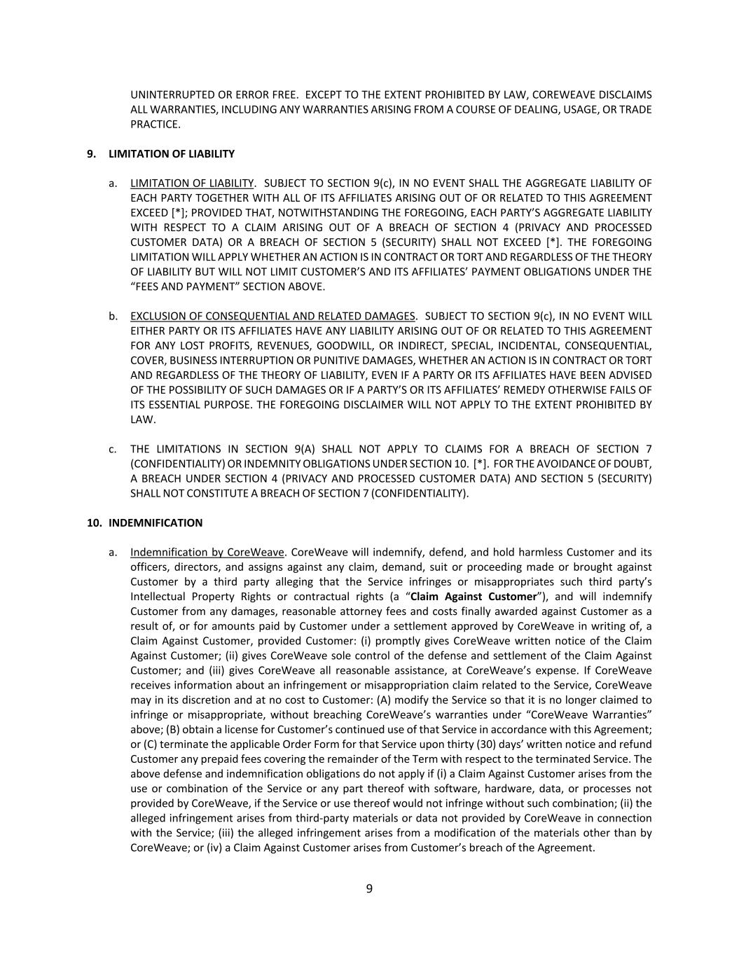 9 UNINTERRUPTED OR ERROR FREE. EXCEPT TO THE EXTENT PROHIBITED BY LAW, COREWEAVE DISCLAIMS ALL WARRANTIES, INCLUDING ANY WARRANTIES ARISING FROM A COURSE OF DEALING, USAGE, OR TRADE PRACTICE. 9. LIMITATION OF LIABILITY a. LIMITATION OF LIABILITY. SUBJECT TO SECTION 9(c), IN NO EVENT SHALL THE AGGREGATE LIABILITY OF EACH PARTY TOGETHER WITH ALL OF ITS AFFILIATES ARISING OUT OF OR RELATED TO THIS AGREEMENT EXCEED [*]; PROVIDED THAT, NOTWITHSTANDING THE FOREGOING, EACH PARTY’S AGGREGATE LIABILITY WITH RESPECT TO A CLAIM ARISING OUT OF A BREACH OF SECTION 4 (PRIVACY AND PROCESSED CUSTOMER DATA) OR A BREACH OF SECTION 5 (SECURITY) SHALL NOT EXCEED [*]. THE FOREGOING LIMITATION WILL APPLY WHETHER AN ACTION IS IN CONTRACT OR TORT AND REGARDLESS OF THE THEORY OF LIABILITY BUT WILL NOT LIMIT CUSTOMER’S AND ITS AFFILIATES’ PAYMENT OBLIGATIONS UNDER THE “FEES AND PAYMENT” SECTION ABOVE. b. EXCLUSION OF CONSEQUENTIAL AND RELATED DAMAGES. SUBJECT TO SECTION 9(c), IN NO EVENT WILL EITHER PARTY OR ITS AFFILIATES HAVE ANY LIABILITY ARISING OUT OF OR RELATED TO THIS AGREEMENT FOR ANY LOST PROFITS, REVENUES, GOODWILL, OR INDIRECT, SPECIAL, INCIDENTAL, CONSEQUENTIAL, COVER, BUSINESS INTERRUPTION OR PUNITIVE DAMAGES, WHETHER AN ACTION IS IN CONTRACT OR TORT AND REGARDLESS OF THE THEORY OF LIABILITY, EVEN IF A PARTY OR ITS AFFILIATES HAVE BEEN ADVISED OF THE POSSIBILITY OF SUCH DAMAGES OR IF A PARTY’S OR ITS AFFILIATES’ REMEDY OTHERWISE FAILS OF ITS ESSENTIAL PURPOSE. THE FOREGOING DISCLAIMER WILL NOT APPLY TO THE EXTENT PROHIBITED BY LAW. c. THE LIMITATIONS IN SECTION 9(A) SHALL NOT APPLY TO CLAIMS FOR A BREACH OF SECTION 7 (CONFIDENTIALITY) OR INDEMNITY OBLIGATIONS UNDER SECTION 10. [*]. FOR THE AVOIDANCE OF DOUBT, A BREACH UNDER SECTION 4 (PRIVACY AND PROCESSED CUSTOMER DATA) AND SECTION 5 (SECURITY) SHALL NOT CONSTITUTE A BREACH OF SECTION 7 (CONFIDENTIALITY). 10. INDEMNIFICATION a. Indemnification by CoreWeave. CoreWeave will indemnify, defend, and hold harmless Customer and its officers, directors, and assigns against any claim, demand, suit or proceeding made or brought against Customer by a third party alleging that the Service infringes or misappropriates such third party’s Intellectual Property Rights or contractual rights (a “Claim Against Customer”), and will indemnify Customer from any damages, reasonable attorney fees and costs finally awarded against Customer as a result of, or for amounts paid by Customer under a settlement approved by CoreWeave in writing of, a Claim Against Customer, provided Customer: (i) promptly gives CoreWeave written notice of the Claim Against Customer; (ii) gives CoreWeave sole control of the defense and settlement of the Claim Against Customer; and (iii) gives CoreWeave all reasonable assistance, at CoreWeave’s expense. If CoreWeave receives information about an infringement or misappropriation claim related to the Service, CoreWeave may in its discretion and at no cost to Customer: (A) modify the Service so that it is no longer claimed to infringe or misappropriate, without breaching CoreWeave’s warranties under “CoreWeave Warranties” above; (B) obtain a license for Customer’s continued use of that Service in accordance with this Agreement; or (C) terminate the applicable Order Form for that Service upon thirty (30) days’ written notice and refund Customer any prepaid fees covering the remainder of the Term with respect to the terminated Service. The above defense and indemnification obligations do not apply if (i) a Claim Against Customer arises from the use or combination of the Service or any part thereof with software, hardware, data, or processes not provided by CoreWeave, if the Service or use thereof would not infringe without such combination; (ii) the alleged infringement arises from third-party materials or data not provided by CoreWeave in connection with the Service; (iii) the alleged infringement arises from a modification of the materials other than by CoreWeave; or (iv) a Claim Against Customer arises from Customer’s breach of the Agreement.
