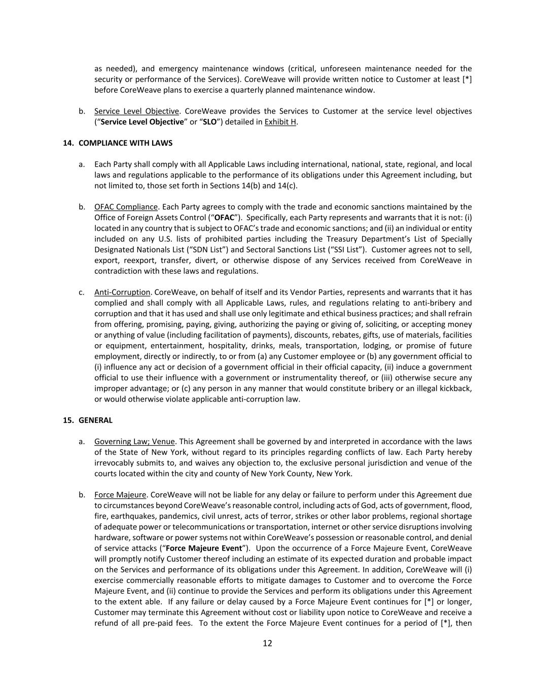 12 as needed), and emergency maintenance windows (critical, unforeseen maintenance needed for the security or performance of the Services). CoreWeave will provide written notice to Customer at least [*] before CoreWeave plans to exercise a quarterly planned maintenance window. b. Service Level Objective. CoreWeave provides the Services to Customer at the service level objectives (“Service Level Objective” or “SLO”) detailed in Exhibit H. 14. COMPLIANCE WITH LAWS a. Each Party shall comply with all Applicable Laws including international, national, state, regional, and local laws and regulations applicable to the performance of its obligations under this Agreement including, but not limited to, those set forth in Sections 14(b) and 14(c). b. OFAC Compliance. Each Party agrees to comply with the trade and economic sanctions maintained by the Office of Foreign Assets Control (“OFAC”). Specifically, each Party represents and warrants that it is not: (i) located in any country that is subject to OFAC’s trade and economic sanctions; and (ii) an individual or entity included on any U.S. lists of prohibited parties including the Treasury Department’s List of Specially Designated Nationals List (“SDN List”) and Sectoral Sanctions List (“SSI List”). Customer agrees not to sell, export, reexport, transfer, divert, or otherwise dispose of any Services received from CoreWeave in contradiction with these laws and regulations. c. Anti-Corruption. CoreWeave, on behalf of itself and its Vendor Parties, represents and warrants that it has complied and shall comply with all Applicable Laws, rules, and regulations relating to anti-bribery and corruption and that it has used and shall use only legitimate and ethical business practices; and shall refrain from offering, promising, paying, giving, authorizing the paying or giving of, soliciting, or accepting money or anything of value (including facilitation of payments), discounts, rebates, gifts, use of materials, facilities or equipment, entertainment, hospitality, drinks, meals, transportation, lodging, or promise of future employment, directly or indirectly, to or from (a) any Customer employee or (b) any government official to (i) influence any act or decision of a government official in their official capacity, (ii) induce a government official to use their influence with a government or instrumentality thereof, or (iii) otherwise secure any improper advantage; or (c) any person in any manner that would constitute bribery or an illegal kickback, or would otherwise violate applicable anti-corruption law. 15. GENERAL a. Governing Law; Venue. This Agreement shall be governed by and interpreted in accordance with the laws of the State of New York, without regard to its principles regarding conflicts of law. Each Party hereby irrevocably submits to, and waives any objection to, the exclusive personal jurisdiction and venue of the courts located within the city and county of New York County, New York. b. Force Majeure. CoreWeave will not be liable for any delay or failure to perform under this Agreement due to circumstances beyond CoreWeave’s reasonable control, including acts of God, acts of government, flood, fire, earthquakes, pandemics, civil unrest, acts of terror, strikes or other labor problems, regional shortage of adequate power or telecommunications or transportation, internet or other service disruptions involving hardware, software or power systems not within CoreWeave’s possession or reasonable control, and denial of service attacks (“Force Majeure Event”). Upon the occurrence of a Force Majeure Event, CoreWeave will promptly notify Customer thereof including an estimate of its expected duration and probable impact on the Services and performance of its obligations under this Agreement. In addition, CoreWeave will (i) exercise commercially reasonable efforts to mitigate damages to Customer and to overcome the Force Majeure Event, and (ii) continue to provide the Services and perform its obligations under this Agreement to the extent able. If any failure or delay caused by a Force Majeure Event continues for [*] or longer, Customer may terminate this Agreement without cost or liability upon notice to CoreWeave and receive a refund of all pre-paid fees. To the extent the Force Majeure Event continues for a period of [*], then
