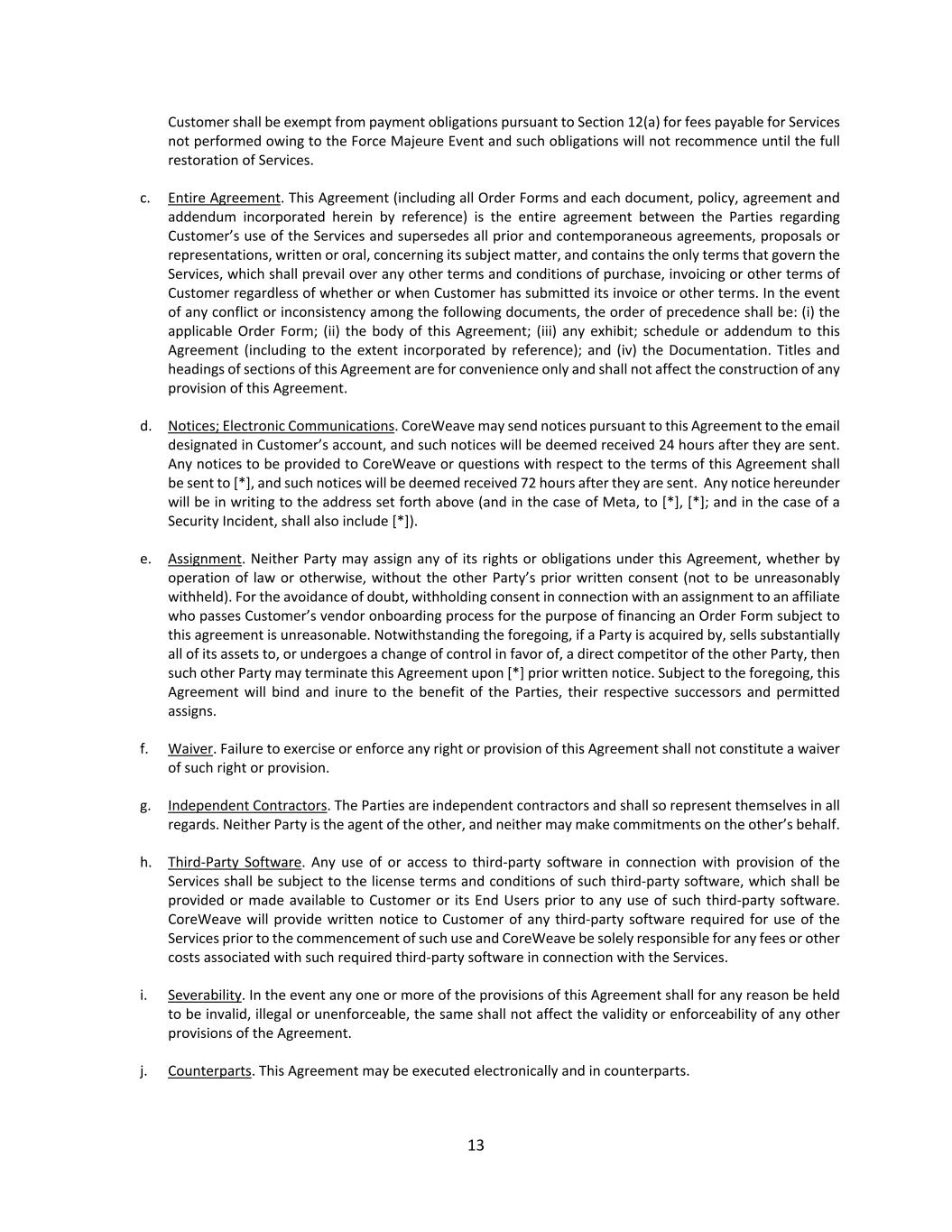 13 Customer shall be exempt from payment obligations pursuant to Section 12(a) for fees payable for Services not performed owing to the Force Majeure Event and such obligations will not recommence until the full restoration of Services. c. Entire Agreement. This Agreement (including all Order Forms and each document, policy, agreement and addendum incorporated herein by reference) is the entire agreement between the Parties regarding Customer’s use of the Services and supersedes all prior and contemporaneous agreements, proposals or representations, written or oral, concerning its subject matter, and contains the only terms that govern the Services, which shall prevail over any other terms and conditions of purchase, invoicing or other terms of Customer regardless of whether or when Customer has submitted its invoice or other terms. In the event of any conflict or inconsistency among the following documents, the order of precedence shall be: (i) the applicable Order Form; (ii) the body of this Agreement; (iii) any exhibit; schedule or addendum to this Agreement (including to the extent incorporated by reference); and (iv) the Documentation. Titles and headings of sections of this Agreement are for convenience only and shall not affect the construction of any provision of this Agreement. d. Notices; Electronic Communications. CoreWeave may send notices pursuant to this Agreement to the email designated in Customer’s account, and such notices will be deemed received 24 hours after they are sent. Any notices to be provided to CoreWeave or questions with respect to the terms of this Agreement shall be sent to [*], and such notices will be deemed received 72 hours after they are sent. Any notice hereunder will be in writing to the address set forth above (and in the case of Meta, to [*], [*]; and in the case of a Security Incident, shall also include [*]). e. Assignment. Neither Party may assign any of its rights or obligations under this Agreement, whether by operation of law or otherwise, without the other Party’s prior written consent (not to be unreasonably withheld). For the avoidance of doubt, withholding consent in connection with an assignment to an affiliate who passes Customer’s vendor onboarding process for the purpose of financing an Order Form subject to this agreement is unreasonable. Notwithstanding the foregoing, if a Party is acquired by, sells substantially all of its assets to, or undergoes a change of control in favor of, a direct competitor of the other Party, then such other Party may terminate this Agreement upon [*] prior written notice. Subject to the foregoing, this Agreement will bind and inure to the benefit of the Parties, their respective successors and permitted assigns. f. Waiver. Failure to exercise or enforce any right or provision of this Agreement shall not constitute a waiver of such right or provision. g. Independent Contractors. The Parties are independent contractors and shall so represent themselves in all regards. Neither Party is the agent of the other, and neither may make commitments on the other’s behalf. h. Third-Party Software. Any use of or access to third-party software in connection with provision of the Services shall be subject to the license terms and conditions of such third-party software, which shall be provided or made available to Customer or its End Users prior to any use of such third-party software. CoreWeave will provide written notice to Customer of any third-party software required for use of the Services prior to the commencement of such use and CoreWeave be solely responsible for any fees or other costs associated with such required third-party software in connection with the Services. i. Severability. In the event any one or more of the provisions of this Agreement shall for any reason be held to be invalid, illegal or unenforceable, the same shall not affect the validity or enforceability of any other provisions of the Agreement. j. Counterparts. This Agreement may be executed electronically and in counterparts.