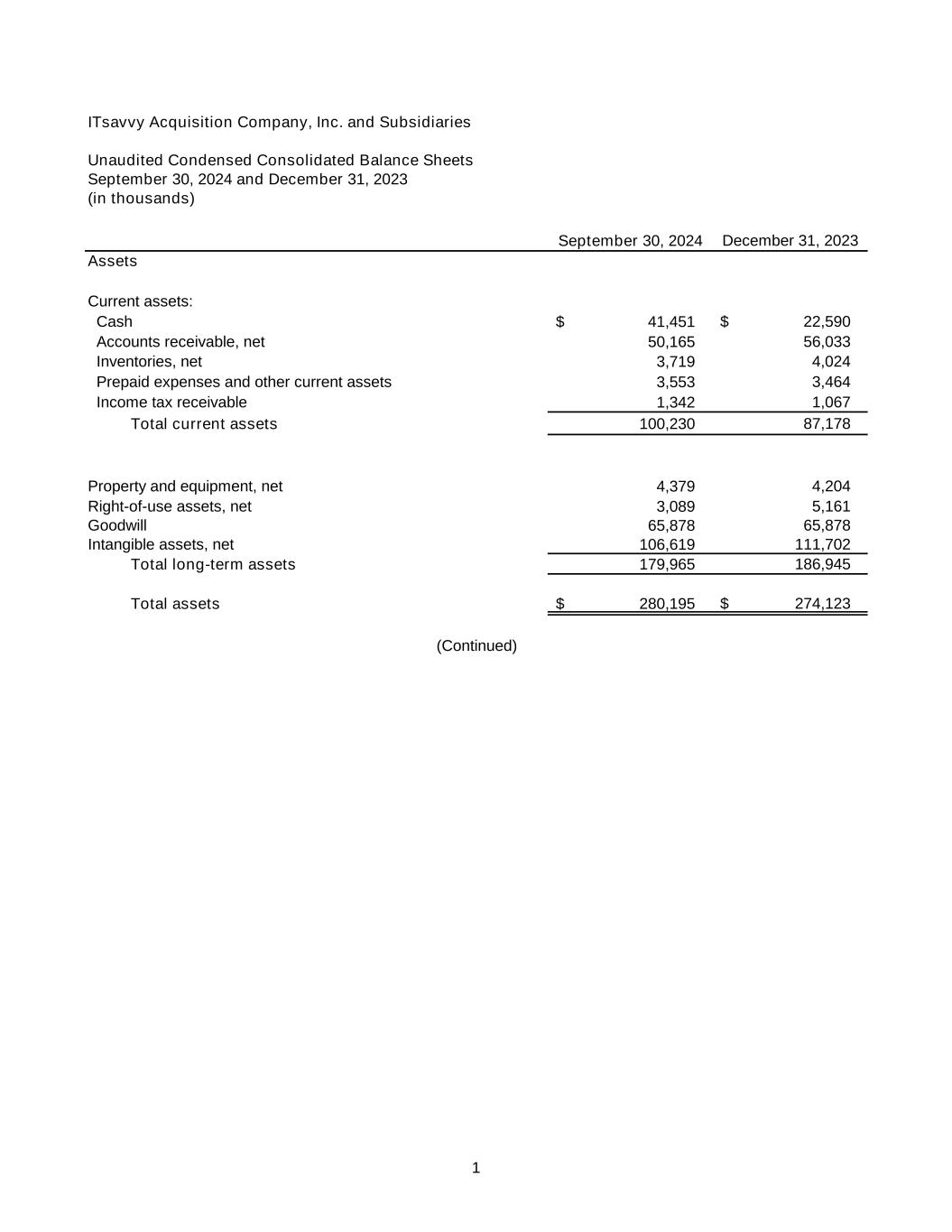 1 September 30, 2024 December 31, 2023 Assets Current assets: Cash 41,451 $ 22,590 $ Accounts receivable, net 50,165 56,033 Inventories, net 3,719 4,024 Prepaid expenses and other current assets 3,553 3,464 Income tax receivable 1,342 1,067 Total current assets 100,230 87,178 Property and equipment, net 4,379 4,204 Right-of-use assets, net 3,089 5,161 Goodwill 65,878 65,878 Intangible assets, net 106,619 111,702 Total long-term assets 179,965 186,945 Total assets 280,195 $ 274,123 $ ITsavvy Acquisition Company, Inc. and Subsidiaries Unaudited Condensed Consolidated Balance Sheets September 30, 2024 and December 31, 2023 (in thousands) (Continued)