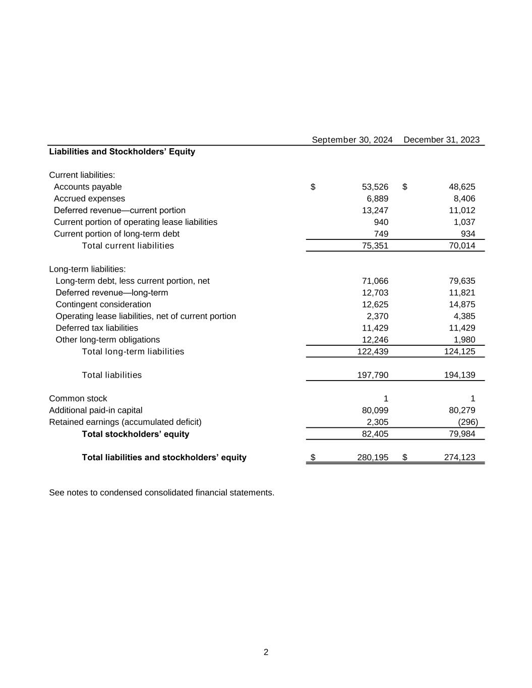 2 September 30, 2024 December 31, 2023 Liabilities and Stockholders’ Equity Current liabilities: Accounts payable 53,526 $ 48,625 $ Accrued expenses 6,889 8,406 Deferred revenue—current portion 13,247 11,012 Current portion of operating lease liabilities 940 1,037 Current portion of long-term debt 749 934 Total current liabilities 75,351 70,014 Long-term liabilities: Long-term debt, less current portion, net 71,066 79,635 Deferred revenue—long-term 12,703 11,821 Contingent consideration 12,625 14,875 Operating lease liabilities, net of current portion 2,370 4,385 Deferred tax liabilities 11,429 11,429 Other long-term obligations 12,246 1,980 Total long-term liabilities 122,439 124,125 Total liabilities 197,790 194,139 Common stock 1 1 Additional paid-in capital 80,099 80,279 Retained earnings (accumulated deficit) 2,305 (296) Total stockholders’ equity 82,405 79,984 Total liabilities and stockholders’ equity 280,195 $ 274,123 $ See notes to condensed consolidated financial statements.