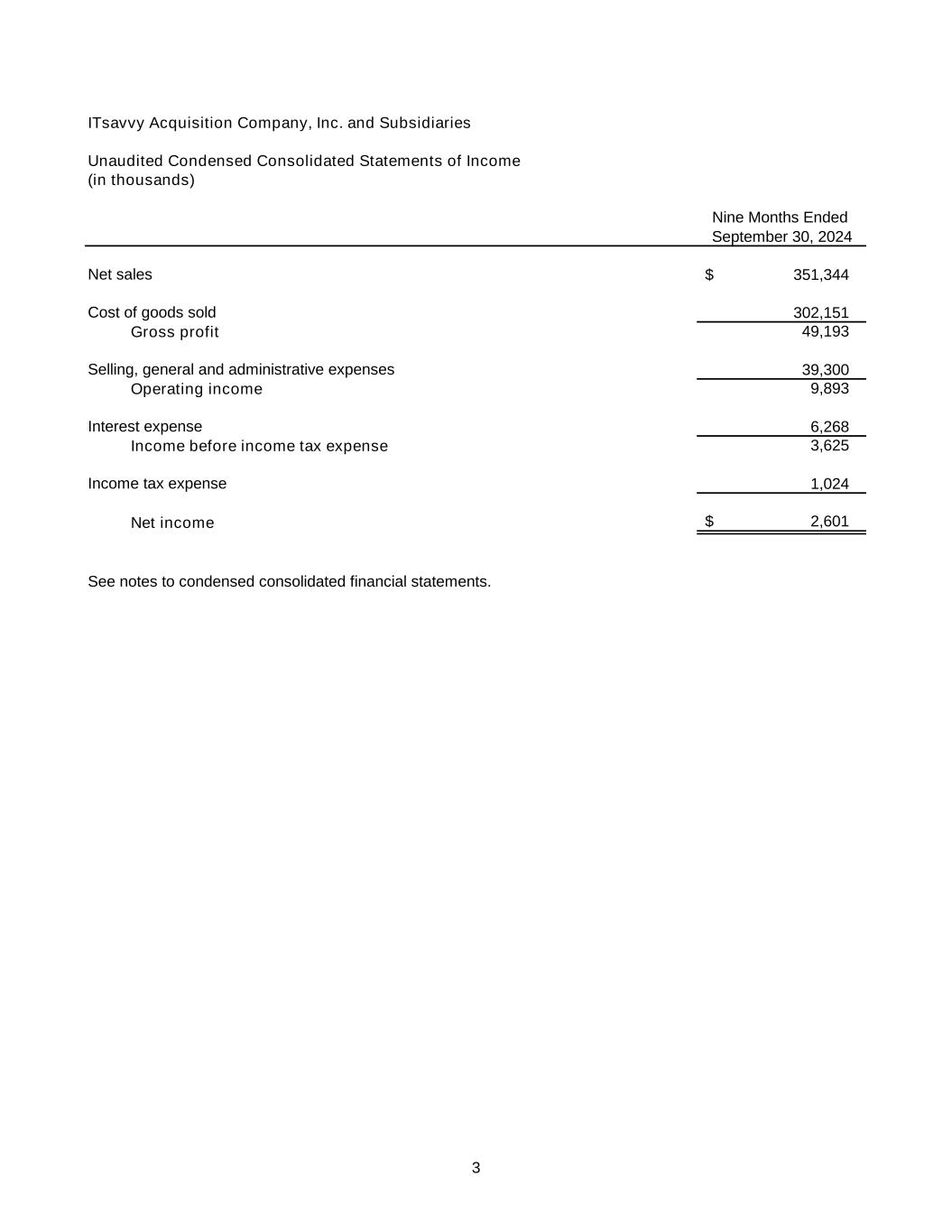 3 ITsavvy Acquisition Company, Inc. and Subsidiaries Unaudited Condensed Consolidated Statements of Income (in thousands) Nine Months Ended September 30, 2024 Net sales 351,344 $ Cost of goods sold 302,151 Gross profit 49,193 Selling, general and administrative expenses 39,300 Operating income 9,893 Interest expense 6,268 Income before income tax expense 3,625 Income tax expense 1,024 Net income 2,601 $ See notes to condensed consolidated financial statements.
