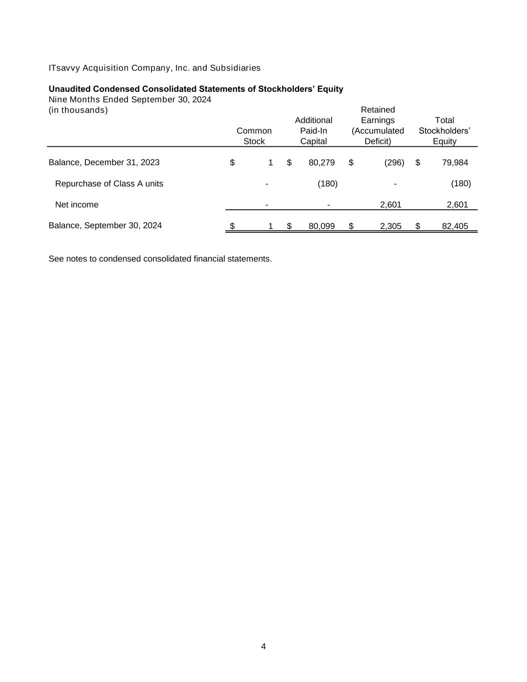 4 ITsavvy Acquisition Company, Inc. and Subsidiaries Unaudited Condensed Consolidated Statements of Stockholders’ Equity Nine Months Ended September 30, 2024 (in thousands) Retained Additional Earnings Total Common Paid-In (Accumulated Stockholders’ Stock Capital Deficit) Equity Balance, December 31, 2023 1 $ 80,279 $ (296) $ 79,984 $ Repurchase of Class A units - (180) - (180) Net income - - 2,601 2,601 Balance, September 30, 2024 1 $ 80,099 $ 2,305 $ 82,405 $ See notes to condensed consolidated financial statements.