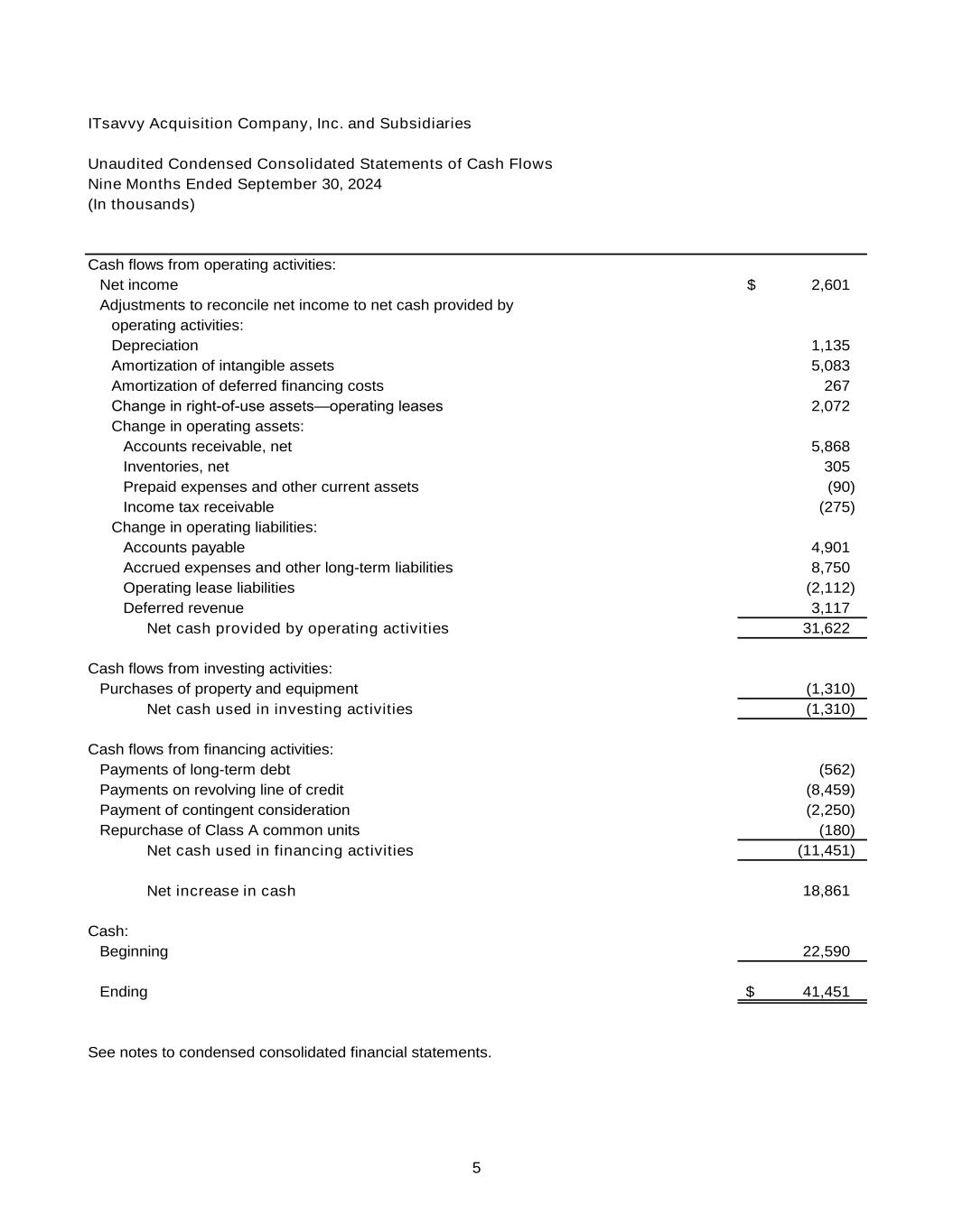 5 ITsavvy Acquisition Company, Inc. and Subsidiaries Unaudited Condensed Consolidated Statements of Cash Flows Nine Months Ended September 30, 2024 (In thousands) Cash flows from operating activities: Net income 2,601 $ Adjustments to reconcile net income to net cash provided by operating activities: Depreciation 1,135 Amortization of intangible assets 5,083 Amortization of deferred financing costs 267 Change in right-of-use assets—operating leases 2,072 Change in operating assets: Accounts receivable, net 5,868 Inventories, net 305 Prepaid expenses and other current assets (90) Income tax receivable (275) Change in operating liabilities: Accounts payable 4,901 Accrued expenses and other long-term liabilities 8,750 Operating lease liabilities (2,112) Deferred revenue 3,117 Net cash provided by operating activities 31,622 Cash flows from investing activities: Purchases of property and equipment (1,310) Net cash used in investing activities (1,310) Cash flows from financing activities: Payments of long-term debt (562) Payments on revolving line of credit (8,459) Payment of contingent consideration (2,250) Repurchase of Class A common units (180) Net cash used in financing activities (11,451) Net increase in cash 18,861 Cash: Beginning 22,590 Ending 41,451 $ See notes to condensed consolidated financial statements.