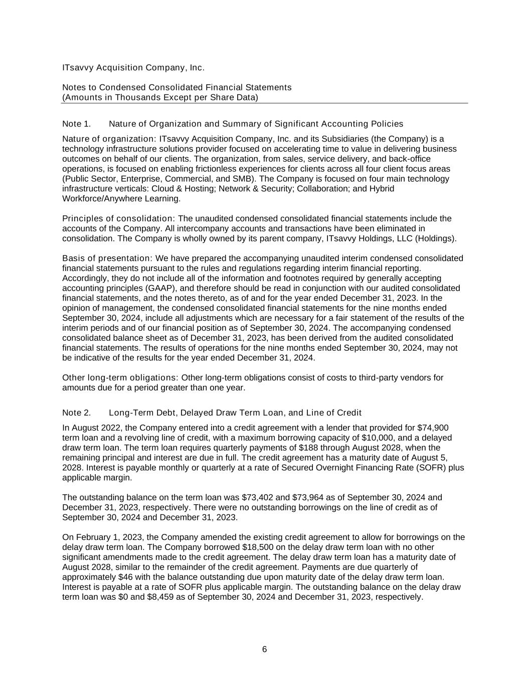 ITsavvy Acquisition Company, Inc. Notes to Condensed Consolidated Financial Statements (Amounts in Thousands Except per Share Data) 6 Note 1. Nature of Organization and Summary of Significant Accounting Policies Nature of organization: ITsavvy Acquisition Company, Inc. and its Subsidiaries (the Company) is a technology infrastructure solutions provider focused on accelerating time to value in delivering business outcomes on behalf of our clients. The organization, from sales, service delivery, and back-office operations, is focused on enabling frictionless experiences for clients across all four client focus areas (Public Sector, Enterprise, Commercial, and SMB). The Company is focused on four main technology infrastructure verticals: Cloud & Hosting; Network & Security; Collaboration; and Hybrid Workforce/Anywhere Learning. Principles of consolidation: The unaudited condensed consolidated financial statements include the accounts of the Company. All intercompany accounts and transactions have been eliminated in consolidation. The Company is wholly owned by its parent company, ITsavvy Holdings, LLC (Holdings). Basis of presentation: We have prepared the accompanying unaudited interim condensed consolidated financial statements pursuant to the rules and regulations regarding interim financial reporting. Accordingly, they do not include all of the information and footnotes required by generally accepting accounting principles (GAAP), and therefore should be read in conjunction with our audited consolidated financial statements, and the notes thereto, as of and for the year ended December 31, 2023. In the opinion of management, the condensed consolidated financial statements for the nine months ended September 30, 2024, include all adjustments which are necessary for a fair statement of the results of the interim periods and of our financial position as of September 30, 2024. The accompanying condensed consolidated balance sheet as of December 31, 2023, has been derived from the audited consolidated financial statements. The results of operations for the nine months ended September 30, 2024, may not be indicative of the results for the year ended December 31, 2024. Other long-term obligations: Other long-term obligations consist of costs to third-party vendors for amounts due for a period greater than one year. Note 2. Long-Term Debt, Delayed Draw Term Loan, and Line of Credit In August 2022, the Company entered into a credit agreement with a lender that provided for $74,900 term loan and a revolving line of credit, with a maximum borrowing capacity of $10,000, and a delayed draw term loan. The term loan requires quarterly payments of $188 through August 2028, when the remaining principal and interest are due in full. The credit agreement has a maturity date of August 5, 2028. Interest is payable monthly or quarterly at a rate of Secured Overnight Financing Rate (SOFR) plus applicable margin. The outstanding balance on the term loan was $73,402 and $73,964 as of September 30, 2024 and December 31, 2023, respectively. There were no outstanding borrowings on the line of credit as of September 30, 2024 and December 31, 2023. On February 1, 2023, the Company amended the existing credit agreement to allow for borrowings on the delay draw term loan. The Company borrowed $18,500 on the delay draw term loan with no other significant amendments made to the credit agreement. The delay draw term loan has a maturity date of August 2028, similar to the remainder of the credit agreement. Payments are due quarterly of approximately $46 with the balance outstanding due upon maturity date of the delay draw term loan. Interest is payable at a rate of SOFR plus applicable margin. The outstanding balance on the delay draw term loan was $0 and $8,459 as of September 30, 2024 and December 31, 2023, respectively.