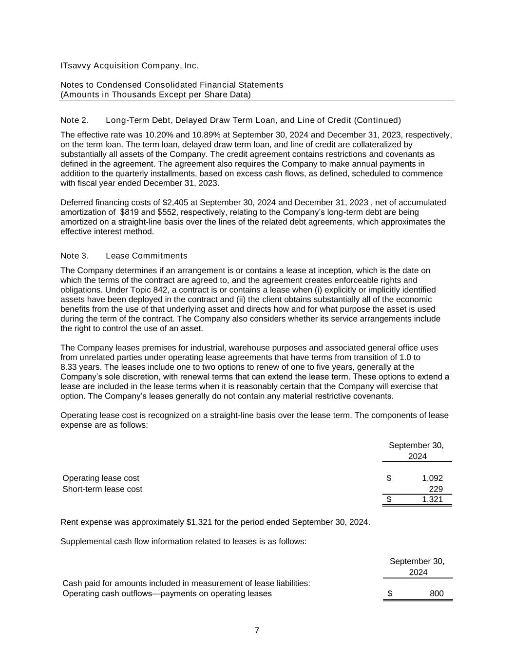 ITsavvy Acquisition Company, Inc. Notes to Condensed Consolidated Financial Statements (Amounts in Thousands Except per Share Data) 7 Note 2. Long-Term Debt, Delayed Draw Term Loan, and Line of Credit (Continued) The effective rate was 10.20% and 10.89% at September 30, 2024 and December 31, 2023, respectively, on the term loan. The term loan, delayed draw term loan, and line of credit are collateralized by substantially all assets of the Company. The credit agreement contains restrictions and covenants as defined in the agreement. The agreement also requires the Company to make annual payments in addition to the quarterly installments, based on excess cash flows, as defined, scheduled to commence with fiscal year ended December 31, 2023. Deferred financing costs of $2,405 at September 30, 2024 and December 31, 2023 , net of accumulated amortization of $819 and $552, respectively, relating to the Company’s long-term debt are being amortized on a straight-line basis over the lines of the related debt agreements, which approximates the effective interest method. Note 3. Lease Commitments The Company determines if an arrangement is or contains a lease at inception, which is the date on which the terms of the contract are agreed to, and the agreement creates enforceable rights and obligations. Under Topic 842, a contract is or contains a lease when (i) explicitly or implicitly identified assets have been deployed in the contract and (ii) the client obtains substantially all of the economic benefits from the use of that underlying asset and directs how and for what purpose the asset is used during the term of the contract. The Company also considers whether its service arrangements include the right to control the use of an asset. The Company leases premises for industrial, warehouse purposes and associated general office uses from unrelated parties under operating lease agreements that have terms from transition of 1.0 to 8.33 years. The leases include one to two options to renew of one to five years, generally at the Company’s sole discretion, with renewal terms that can extend the lease term. These options to extend a lease are included in the lease terms when it is reasonably certain that the Company will exercise that option. The Company’s leases generally do not contain any material restrictive covenants. Operating lease cost is recognized on a straight-line basis over the lease term. The components of lease expense are as follows: September 30, 2024 Operating lease cost 1,092 $ Short-term lease cost 229 1,321 $ Rent expense was approximately $1,321 for the period ended September 30, 2024. Supplemental cash flow information related to leases is as follows: September 30, 2024 Cash paid for amounts included in measurement of lease liabilities: Operating cash outflows—payments on operating leases 800 $