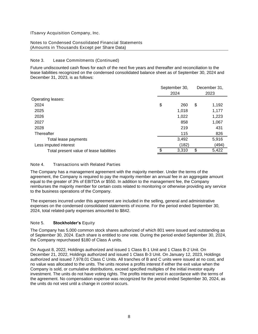 ITsavvy Acquisition Company, Inc. Notes to Condensed Consolidated Financial Statements (Amounts in Thousands Except per Share Data) 8 Note 3. Lease Commitments (Continued) Future undiscounted cash flows for each of the next five years and thereafter and reconciliation to the lease liabilities recognized on the condensed consolidated balance sheet as of September 30, 2024 and December 31, 2023, is as follows: September 30, December 31, 2024 2023 Operating leases: 2024 260 $ 1,192 $ 2025 1,018 1,177 2026 1,022 1,223 2027 858 1,067 2028 219 431 Thereafter 115 826 Total lease payments 3,492 5,916 Less imputed interest (182) (494) Total present value of lease liabilities 3,310 $ 5,422 $ Note 4. Transactions with Related Parties The Company has a management agreement with the majority member. Under the terms of the agreement, the Company is required to pay the majority member an annual fee in an aggregate amount equal to the greater of 3% of EBITDA or $550. In addition to the management fee, the Company reimburses the majority member for certain costs related to monitoring or otherwise providing any service to the business operations of the Company. The expenses incurred under this agreement are included in the selling, general and administrative expenses on the condensed consolidated statements of income. For the period ended September 30, 2024, total related-party expenses amounted to $842. Note 5. Stockholder’s Equity The Company has 5,000 common stock shares authorized of which 801 were issued and outstanding as of September 30, 2024. Each share is entitled to one vote. During the period ended September 30, 2024, the Company repurchased $180 of Class A units. On August 8, 2022, Holdings authorized and issued 1 Class B-1 Unit and 1 Class B-2 Unit. On December 21, 2022, Holdings authorized and issued 1 Class B-3 Unit. On January 12, 2023, Holdings authorized and issued 7,978.01 Class C Units. All tranches of B and C units were issued at no cost, and no value was allocated to the units. The units receive a profits interest if either the exit value when the Company is sold, or cumulative distributions, exceed specified multiples of the initial investor equity investment. The units do not have voting rights. The profits interest vest in accordance with the terms of the agreement. No compensation expense was recognized for the period ended September 30, 2024, as the units do not vest until a change in control occurs.