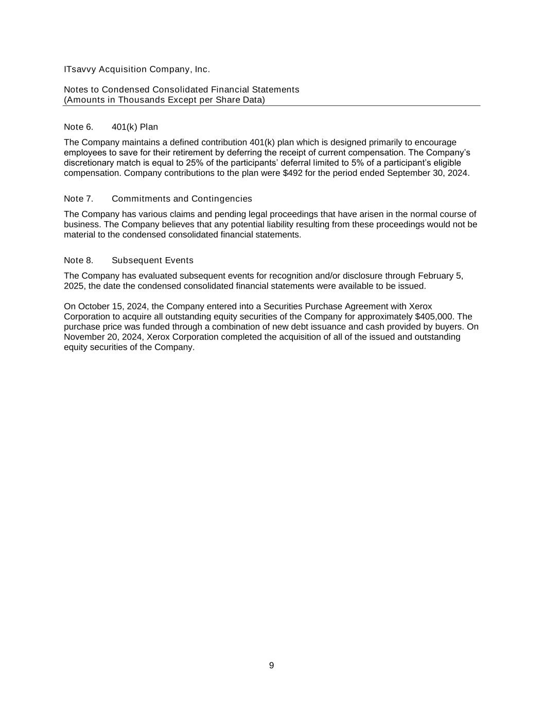 ITsavvy Acquisition Company, Inc. Notes to Condensed Consolidated Financial Statements (Amounts in Thousands Except per Share Data) 9 Note 6. 401(k) Plan The Company maintains a defined contribution 401(k) plan which is designed primarily to encourage employees to save for their retirement by deferring the receipt of current compensation. The Company’s discretionary match is equal to 25% of the participants’ deferral limited to 5% of a participant’s eligible compensation. Company contributions to the plan were $492 for the period ended September 30, 2024. Note 7. Commitments and Contingencies The Company has various claims and pending legal proceedings that have arisen in the normal course of business. The Company believes that any potential liability resulting from these proceedings would not be material to the condensed consolidated financial statements. Note 8. Subsequent Events The Company has evaluated subsequent events for recognition and/or disclosure through February 5, 2025, the date the condensed consolidated financial statements were available to be issued. On October 15, 2024, the Company entered into a Securities Purchase Agreement with Xerox Corporation to acquire all outstanding equity securities of the Company for approximately $405,000. The purchase price was funded through a combination of new debt issuance and cash provided by buyers. On November 20, 2024, Xerox Corporation completed the acquisition of all of the issued and outstanding equity securities of the Company.