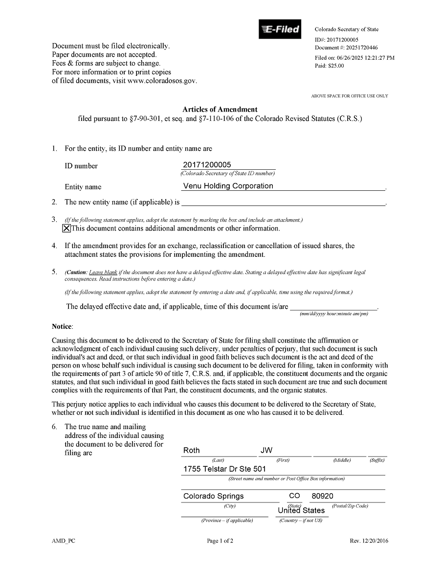 FIRST: The name of the Corporation is Venu Holding Corporation, a Colorado corporation (the “Corporation”);