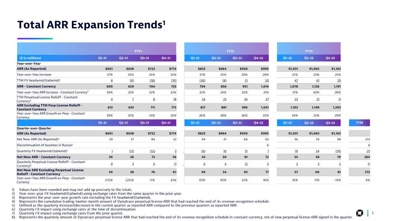 v Total ARR Expansion Trends1 FY21 FY22 FY23 ($ in millions) Q1-21 Q2-21 Q3-21 Q4-21 Q1-22 Q2-22 Q3-22 Q4-22 Q1-23 Q2-23 Q3-23 Year-over-Year ARR (As Reported) $601 $638 $722 $774 $823 $864 $930 $995 $1,031 $1,065 $1,163 Year-over-Year increase 37% 35% 35% 35% 37% 35% 29% 29% 25% 23% 25% TTM FX headwind/(tailwind)2 8 (9) (18) (19) (30) (8) 21 20 47 61 29 ARR - Constant Currency 609 629 704 755 794 856 951 1,014 1,078 1,126 1,191 Year-over-Year ARR Increase - Constant Currency3 39% 33% 32% 32% 32% 34% 32% 31% 31% 30% 28% TTM Perpetual License Rolloff - Constant Currency4 4 7 8 18 24 25 34 27 23 21 11 ARR Excluding TTM Perp License Rolloff - Constant Currency 613 635 711 773 817 881 985 1,041 1,102 1,148 1,203 Year-over-Year ARR Growth ex-Perp - Constant Currency 39% 35% 33% 35% 36% 38% 36% 35% 34% 33% 29% Q1-21 Q2-21 Q3-21 Q4-21 Q1-22 Q2-22 Q3-22 Q4-22 Q1-23 Q2-23 Q3-23 TTM Quarter-over-Quarter ARR (As Reported) $601 $638 $722 $774 $823 $864 $930 $995 $1,031 $1,065 $1,163 Net New ARR (As Reported)5 29 37 84 52 49 41 66 65 36 34 98 233 Discontinuation of business in Russia6 6 6 Quarterly FX headwind/(tailwind)7 1 (11) (12) 3 (6) 10 15 1 19 24 (19) 25 Net New ARR - Constant Currency 30 26 72 56 43 50 81 72 55 58 79 264 Quarterly Perpetual License Rolloff - Constant Currency8 0 3 4 11 6 4 12 5 2 2 2 11 Net New ARR Excluding Perpetual License Rolloff - Constant Currency 30 28 76 67 49 54 93 77 57 60 81 275 Year-over-Year ARR Growth ex-Perp - Constant Currency (17)% (25)% 17% 61% 63% 92% 22% 16% 16% 11% -13% 4% 1
