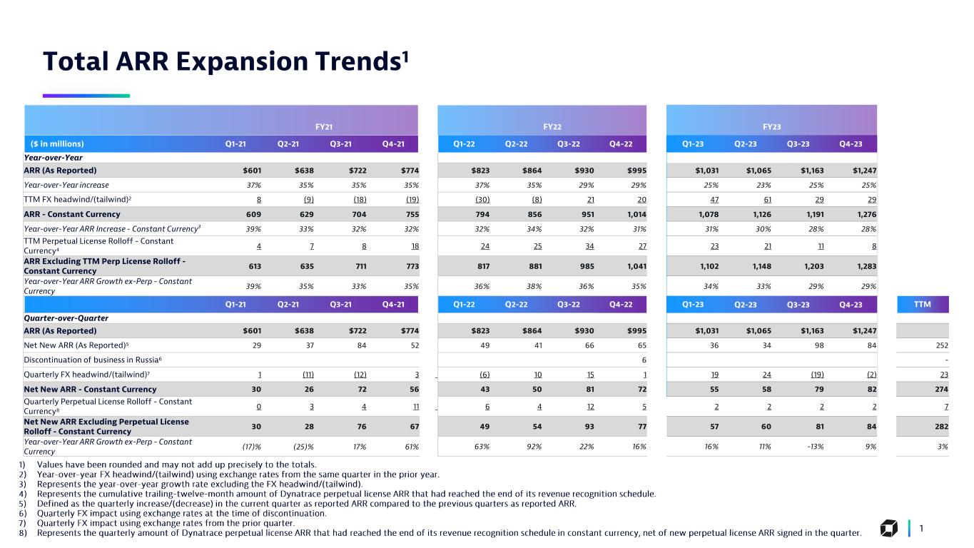 v Total ARR Expansion Trends1 1 FY21 FY22 FY23 ($ in millions) Q1-21 Q2-21 Q3-21 Q4-21 Q1-22 Q2-22 Q3-22 Q4-22 Q1-23 Q2-23 Q3-23 Q4-23 Year-over-Year ARR (As Reported) $601 $638 $722 $774 $823 $864 $930 $995 $1,031 $1,065 $1,163 $1,247 Year-over-Year increase 37% 35% 35% 35% 37% 35% 29% 29% 25% 23% 25% 25% TTM FX headwind/(tailwind)2 8 (9) (18) (19) (30) (8) 21 20 47 61 29 29 ARR - Constant Currency 609 629 704 755 794 856 951 1,014 1,078 1,126 1,191 1,276 Year-over-Year ARR Increase - Constant Currency3 39% 33% 32% 32% 32% 34% 32% 31% 31% 30% 28% 28% TTM Perpetual License Rolloff - Constant Currency4 4 7 8 18 24 25 34 27 23 21 11 8 ARR Excluding TTM Perp License Rolloff - Constant Currency 613 635 711 773 817 881 985 1,041 1,102 1,148 1,203 1,283 Year-over-Year ARR Growth ex-Perp - Constant Currency 39% 35% 33% 35% 36% 38% 36% 35% 34% 33% 29% 29% Q1-21 Q2-21 Q3-21 Q4-21 Q1-22 Q2-22 Q3-22 Q4-22 Q1-23 Q2-23 Q3-23 Q4-23 TTM Quarter-over-Quarter ARR (As Reported) $601 $638 $722 $774 $823 $864 $930 $995 $1,031 $1,065 $1,163 $1,247 Net New ARR (As Reported)5 29 37 84 52 49 41 66 65 36 34 98 84 252 Discontinuation of business in Russia6 6 - Quarterly FX headwind/(tailwind)7 1 (11) (12) 3 (6) 10 15 1 19 24 (19) (2) 23 Net New ARR - Constant Currency 30 26 72 56 43 50 81 72 55 58 79 82 274 Quarterly Perpetual License Rolloff - Constant Currency8 0 3 4 11 6 4 12 5 2 2 2 2 7 Net New ARR Excluding Perpetual License Rolloff - Constant Currency 30 28 76 67 49 54 93 77 57 60 81 84 282 Year-over-Year ARR Growth ex-Perp - Constant Currency (17)% (25)% 17% 61% 63% 92% 22% 16% 16% 11% -13% 9% 3%
