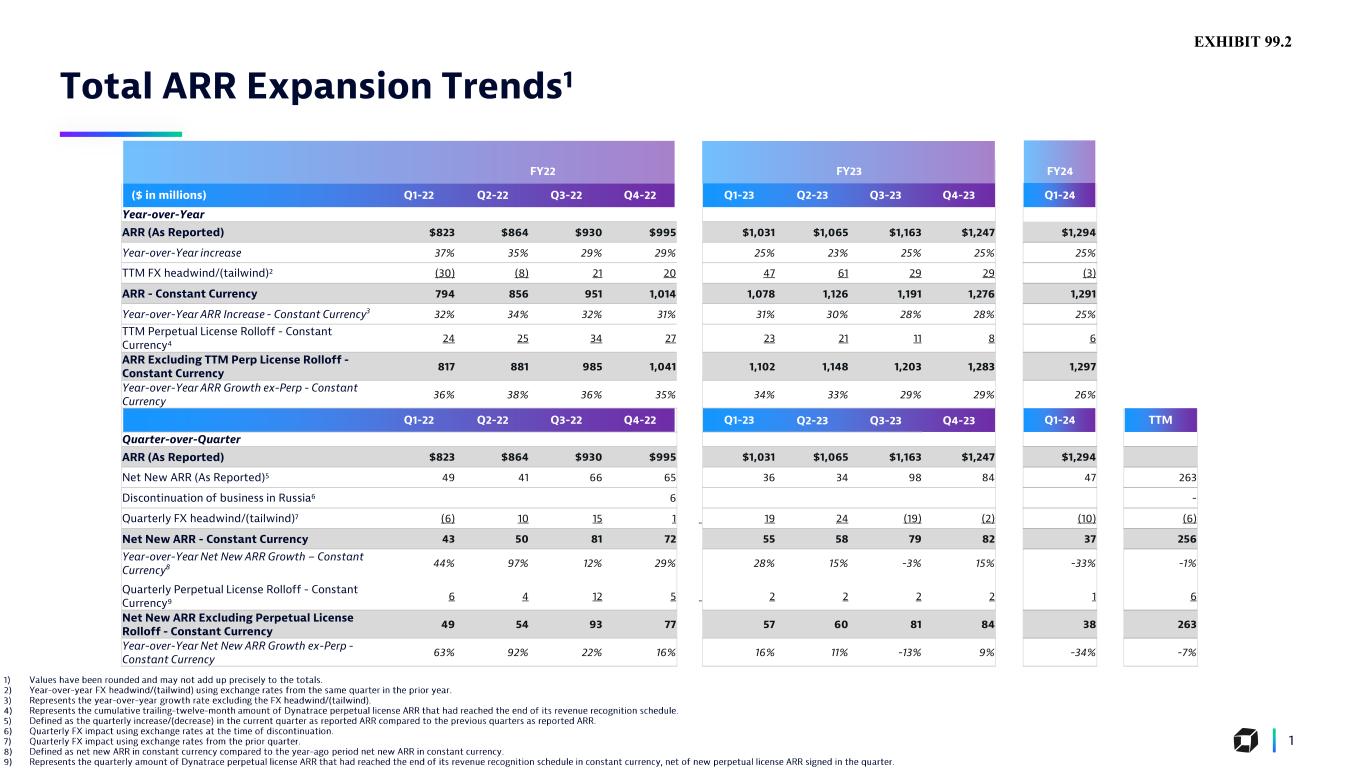v Total ARR Expansion Trends1 1 FY22 FY23 FY24 ($ in millions) Q1-22 Q2-22 Q3-22 Q4-22 Q1-23 Q2-23 Q3-23 Q4-23 Q1-24 Year-over-Year ARR (As Reported) $823 $864 $930 $995 $1,031 $1,065 $1,163 $1,247 $1,294 Year-over-Year increase 37% 35% 29% 29% 25% 23% 25% 25% 25% TTM FX headwind/(tailwind)2 (30) (8) 21 20 47 61 29 29 (3) ARR - Constant Currency 794 856 951 1,014 1,078 1,126 1,191 1,276 1,291 Year-over-Year ARR Increase - Constant Currency3 32% 34% 32% 31% 31% 30% 28% 28% 25% TTM Perpetual License Rolloff - Constant Currency4 24 25 34 27 23 21 11 8 6 ARR Excluding TTM Perp License Rolloff - Constant Currency 817 881 985 1,041 1,102 1,148 1,203 1,283 1,297 Year-over-Year ARR Growth ex-Perp - Constant Currency 36% 38% 36% 35% 34% 33% 29% 29% 26% Q1-22 Q2-22 Q3-22 Q4-22 Q1-23 Q2-23 Q3-23 Q4-23 Q1-24 TTM Quarter-over-Quarter ARR (As Reported) $823 $864 $930 $995 $1,031 $1,065 $1,163 $1,247 $1,294 Net New ARR (As Reported)5 49 41 66 65 36 34 98 84 47 263 Discontinuation of business in Russia6 6 - Quarterly FX headwind/(tailwind)7 (6) 10 15 1 19 24 (19) (2) (10) (6) Net New ARR - Constant Currency 43 50 81 72 55 58 79 82 37 256 Year-over-Year Net New ARR Growth – Constant Currency8 44% 97% 12% 29% 28% 15% -3% 15% -33% -1% Quarterly Perpetual License Rolloff - Constant Currency9 6 4 12 5 2 2 2 2 1 6 Net New ARR Excluding Perpetual License Rolloff - Constant Currency 49 54 93 77 57 60 81 84 38 263 Year-over-Year Net New ARR Growth ex-Perp - Constant Currency 63% 92% 22% 16% 16% 11% -13% 9% -34% -7% EXHIBIT 99.2
