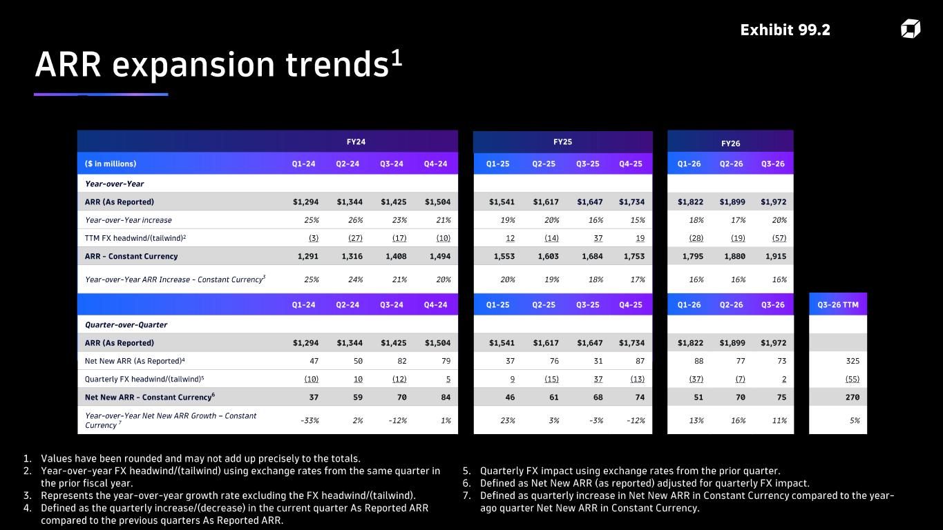 ARR expansion trends 1 1 1. Values have been rounded and may not add up precisely to the totals. 2. Year - over- year FX headwind/(tailwind) using exchange rates from the same quarter in the prior fiscal year. 3. Represents the year - over- year growth rate excluding the FX headwind/(tailwind). 4. Defined as the quarterly increase/(decrease) in the current quarter As Reported ARR compared to the previous quarters As Reported ARR. 5. Quarterly FX impact using exchange rates from the prior quarter. 6. Defined as Net New ARR (as reported) adjusted for quarterly FX impact. 7. Defined as quarterly increase in Net New ARR in Constant Currency compared to the year - ago quarter Net New ARR in Constant Currency . FY24 FY25 FY26 ($ in millions) Q1- 24 Q2- 24 Q3- 24 Q4- 24 Q1- 25 Q2- 25 Q3- 25 Q4- 25 Q1- 26 Q2- 26 Q3- 26 Year - over - Year ARR (As Reported) $1,294 $1,344 $1,425 $1,504 $1,541 $1,617 $1,647 $1,734 $1,822 $1,899 $1,972 Year - over - Year increase 25% 26% 23% 21% 19% 20% 16% 15% 18% 17% 20% TTM FX headwind/(tailwind) 2 (3) (27) (17) (10) 12 (14) 37 19 (28) (19) (57) ARR - Constant Currency 1,291 1,316 1,408 1,494 1,553 1,603 1,684 1,753 1,795 1,880 1,915 Year - over - Year ARR Increase - Constant Currency 3 25% 24% 21% 20% 20% 19% 18% 17% 16% 16% 16% Q1- 24 Q2- 24 Q3- 24 Q4- 24 Q1- 25 Q2- 25 Q3- 25 Q4- 25 Q1- 26 Q2- 26 Q3- 26 Q3- 26 TTM Quarter - over - Quarter ARR (As Reported) $1,294 $1,344 $1,425 $1,504 $1,541 $1,617 $1,647 $1,734 $1,822 $1,899 $1,972 Net New ARR (As Reported) 4 47 50 82 79 37 76 31 87 88 77 73 325 Quarterly FX headwind/(tailwind) 5 (10) 10 (12) 5 9 (15) 37 (13) (37) (7) 2 (55) Net New ARR - Constant Currency 6 37 59 70 84 46 61 68 74 51 70 75 270 Year - over - Year Net New ARR Growth – Constant Currency 7 - 33% 2% - 12% 1% 23% 3% - 3% - 12% 13% 16% 11% 5% Exhibit 99.2