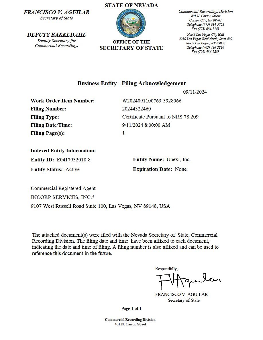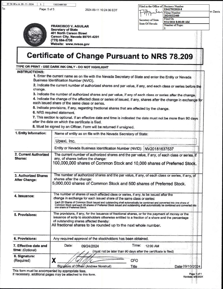 EX-3.1 2 upxi_ex31.htm CERTIFICATE OF CHANGE upxi_ex31.htm