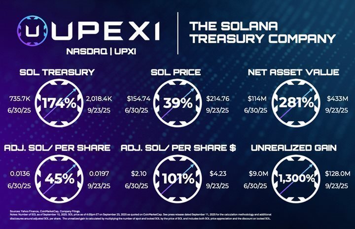 Treasury: Upexi held 2,018,419 SOL1, up 174% from the 735,692 SOL held on June 30, 2025.