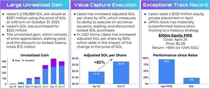 Source: Company filings. Note: SOL count as of October 31. Treasury value calculated using price of SOL on October 31. Unrealized gain measured as of disclosure dates, with gain from SOL appreciation, staking income, and the discount. See press release dated September 11, 2025  for calculation and disclosures on adjusted SOL per share. Raise returns based on UPXI price as of October 31. SOL performance is from the date of the raise close until 4:00pm EST on October 31 for comparability.