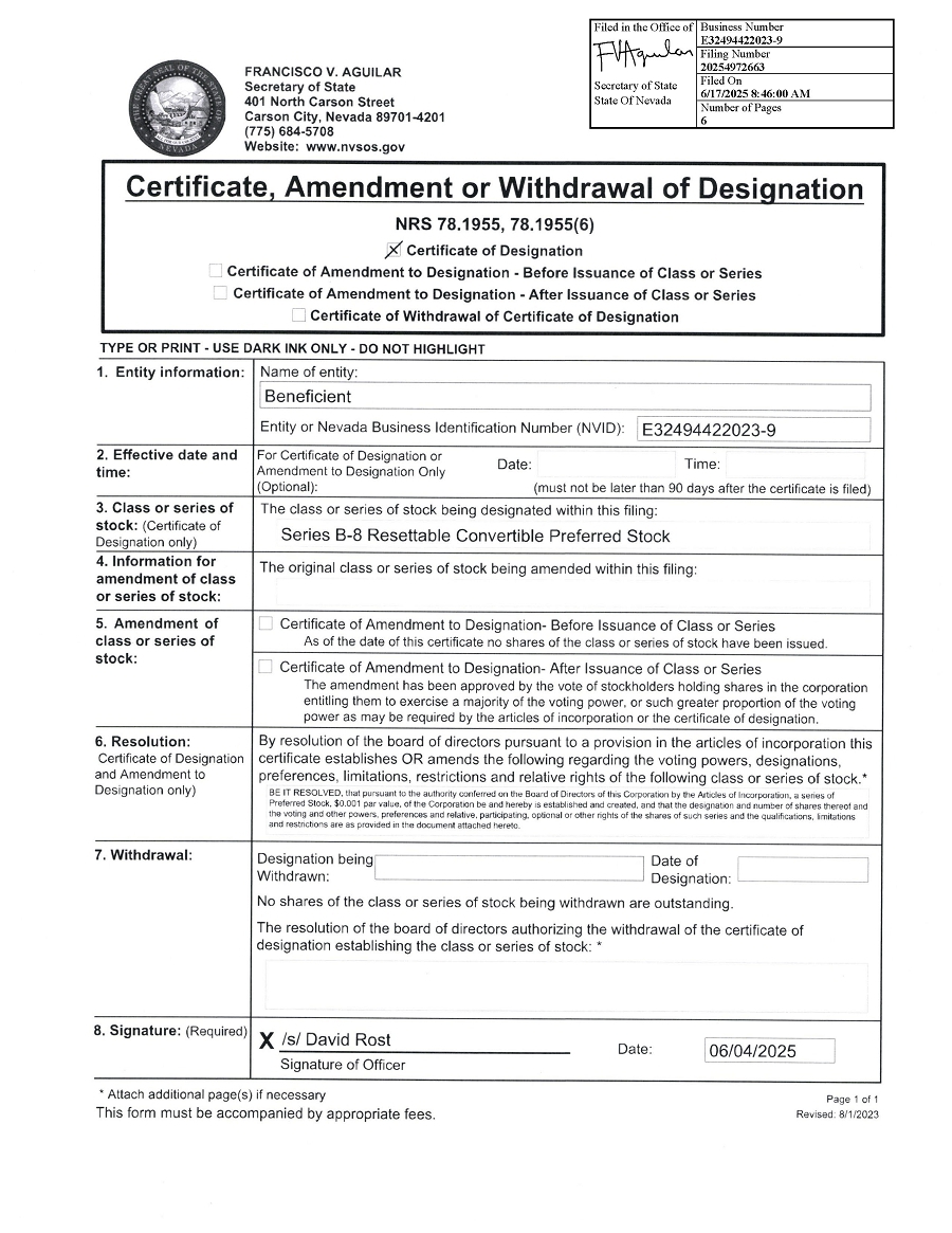 Beneficient, a corporation organized and existing under the laws of the State of Nevada (the “Corporation”), does hereby certify that, pursuant to the authority conferred on its board of directors (the “Board of Directors”) by its articles of incorporation (the “Articles of Incorporation”) and in accordance with Section 78.1955 of the Nevada Revised Statutes, the Board of Directors adopted the following resolution establishing a series of 191,037 shares of Preferred Stock of the Corporation designated as Series B-8 Resettable Convertible Preferred Stock.