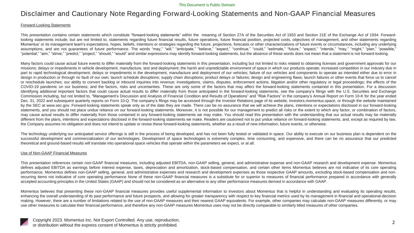 Copyright 2023. Momentus Inc. Not Export Controlled. Any use, reproduction, or distribution without the express consent of Momentus is strictly prohibited. This Document is Public Domain Disclaimer and Cautionary Note Regarding Forward-Looking Statements and Non-GAAP Financial Measures Forward-Looking Statements This presentation contains certain statements which constitute “forward-looking statements” within the meaning of Section 27A of the Securities Act of 1933 and Section 21E of the Exchange Act of 1934. Forward- looking statements include, but are not limited to, statements regarding future financial results, future operations, future financial position, projected costs, objectives of management, and other statements regarding Momentus’ or its management team’s expectations, hopes, beliefs, intentions or strategies regarding the future, projections, forecasts or other characterizations of future events or circumstances, including any underlying assumptions, and are not guarantees of future performance. The words “may,” “will,” “anticipate,” “believe,” “expect,” “continue,” “could,” “estimate,” “future,” “expect,” “intends,” “may,” “might,” “plan,” “possible,” “potential,” “aim,” “strive,” “predict,” “project,” “should,” “would” and similar expressions may identify forward-looking statements, but the absence of these words does not mean that a statement is not forward-looking. Many factors could cause actual future events to differ materially from the forward-looking statements in this presentation, including but not limited to risks related to obtaining licenses and government approvals for our missions; delays or impediments in vehicle development, manufacture, test and deployment; the harsh and unpredictable environment of space in which our products operate; increased competition in our industry due in part to rapid technological development; delays or impediments in the development, manufacture and deployment of our vehicles; failure of our vehicles and components to operate as intended either due to error in design in production or through no fault of our own; launch schedule disruptions; supply chain disruptions; product delays or failures; design and engineering flaws; launch failures or other events that force us to cancel or reschedule launches; our ability to convert backlog or inbound inquiries into revenue; investigations, claims, disputes, enforcement actions, litigation and/or other regulatory or legal proceedings; the effects of the COVID-19 pandemic on our business; and the factors, risks and uncertainties. These are only some of the factors that may affect the forward-looking statements contained in this presentation. For a discussion identifying additional important factors that could cause actual results to differ materially from those anticipated in the forward-looking statements, see the company’s filings with the U.S. Securities and Exchange Commission including, but not limited to, “Management’s Discussion and Analysis of Financial Condition and Results of Operations” and “Risk Factors” in the company’s Annual Report on Form 10-K for the year ended Dec. 31, 2022 and subsequent quarterly reports on Form 10-Q. The company’s filings may be accessed through the Investor Relations page of its website, investors.momentus.space, or through the website maintained by the SEC at www.sec.gov. Forward-looking statements speak only as of the date they are made. There can be no assurance that we will achieve the plans, intentions or expectations disclosed in our forward-looking statements, and you should not place undue reliance on our forward-looking statements. Moreover, it is not possible for our management to predict all risks or the extent to which any factor, or combination of factors, may cause actual results to differ materially from those contained in any forward-looking statements we may make. You should read this presentation with the understanding that our actual results may be materially different from the plans, intentions and expectations disclosed in the forward-looking statements we make. Readers are cautioned not to put undue reliance on forward-looking statements, and, except as required by law, the Company assumes no obligation and does not intend to update or revise these forward-looking statements, whether as a result of new information, future events, or otherwise. The technology underlying our anticipated service offerings is still in the process of being developed, and has not been fully tested or validated in space. Our ability to execute on our business plan is dependent on the successful development and commercialization of our technologies. Development of space technologies is extremely complex, time consuming, and expensive, and there can be no assurance that our predicted theoretical and ground-based results will translate into operational space vehicles that operate within the parameters we expect, or at all. Use of Non-GAAP Financial Measures This presentation references certain non-GAAP financial measures, including adjusted EBITDA, non-GAAP selling, general, and administrative expense and non-GAAP research and development expense. Momentus defines adjusted EBITDA as earnings before interest expense, taxes, depreciation and amortization, stock-based compensation, and certain other items Momentus believes are not indicative of its core operating performance. Momentus defines non-GAAP selling, general, and administrative expenses and research and development expenses as those respective GAAP amounts, excluding stock-based compensation and non- recurring items not indicative of core operating performance None of these non-GAAP financial measures is a substitute for or superior to measures of financial performance prepared in accordance with generally accepted accounting principles in the United States (GAAP) and should not be consid