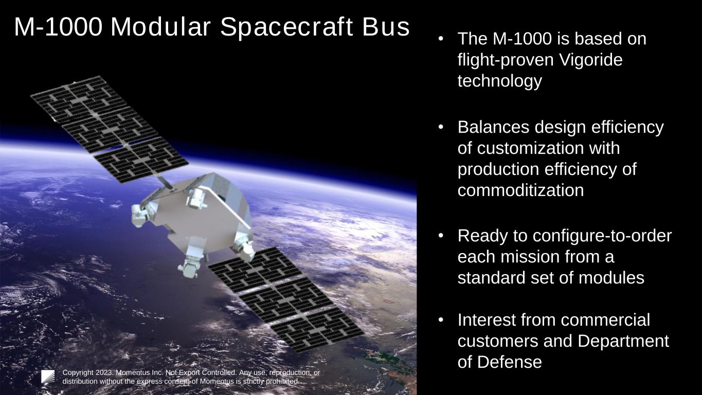 This Document is Public Domain Copyright 2023. Momentus Inc. Not Export Controlled. Any use, reproduction, or distribution without the express consent of Momentus is strictly prohibited. M-1000 Modular Spacecraft Bus • Balances design efficiency of customization with production efficiency of commoditization • Ready to configure-to-order each mission from a standard set of modules • Interest from commercial customers and Department of Defense • The M-1000 is based on flight-proven Vigoride technology