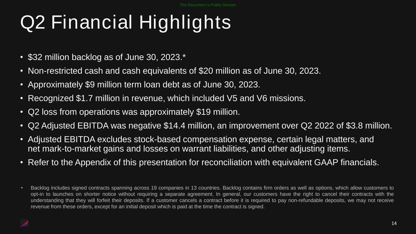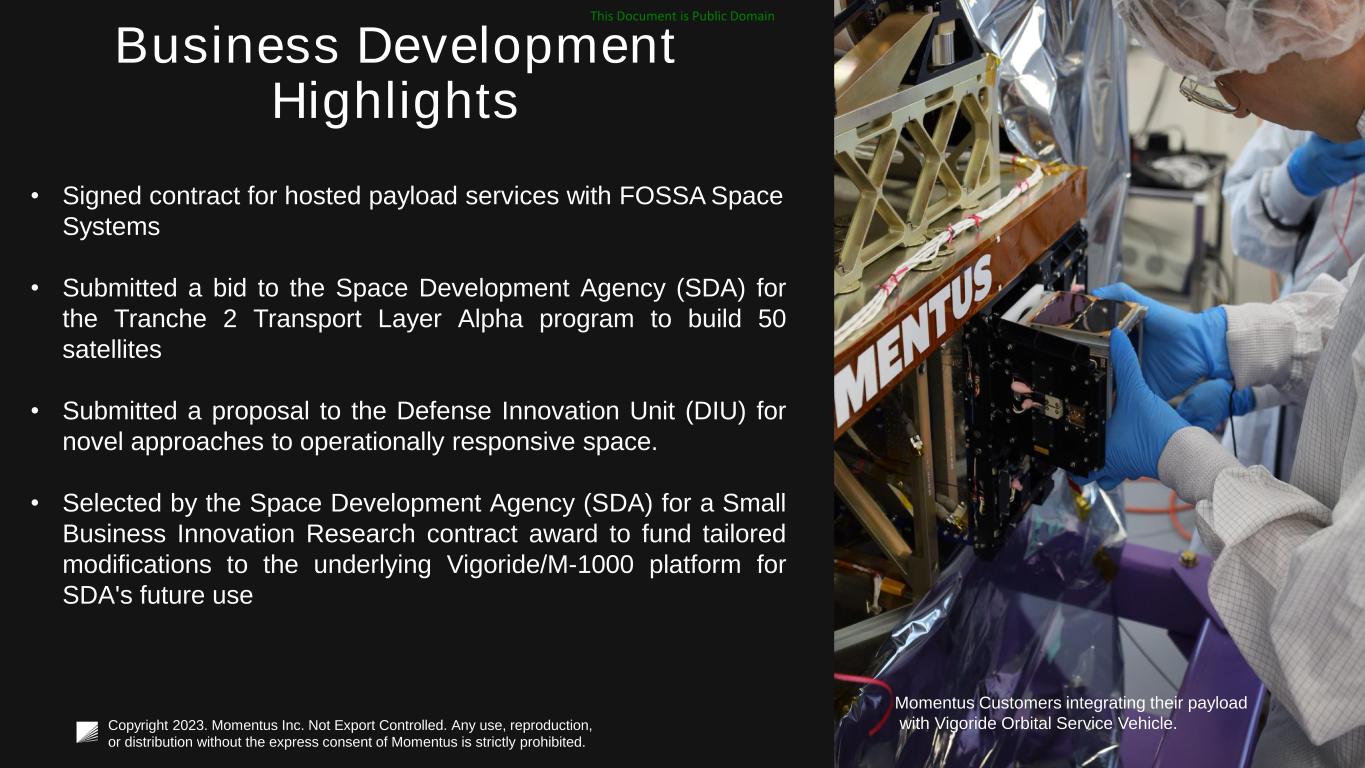 Copyright 2023. Momentus Inc. Not Export Controlled. Any use, reproduction, or distribution without the express consent of Momentus is strictly prohibited. This Document is Public Domain Copyright 023. Momentus Inc. Not Export Controlled. Any use, reproduction, or distribution without th express consent of Momentu is strictly prohibited. Q2 2023 Business and Financial Highlights August 14, 2023