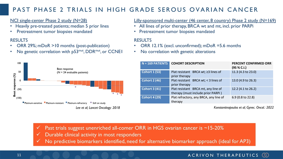 CLINICAL OVERVIEW OF ACR -368 MONOTHERAPY (PAST DATA) # Indication Trial ORR (confirmed) Median DoR° Reference HGSOC* (BRCA wild type, primarily Phase 2 single center 29% >10 months^ Lee et al, Lancet platinum-resistant) (NCI) Oncology, 2018 HGSOC (BRCA wild type and mutant; Phase 2 multi-center 12.1% (platinum-resistant) 5.6 months Konstantinopoulos platinum-resistant and refractory) (Lilly) et al; Gynec. Oncol.: 2022 Squamous cell cancer (anal cancer, Phase 1b multi-center 19% HPV+ H&N 7 months (HPV+ H&N) Hong et al, CCR, head & neck cancer [H&N]) (Lilly) 15% anal cancer 12 months anal cancer 2018 Dosing and Administration 2 • IV q14d (RP2D = 105 mg/m ) Safety summary • Acceptable safety profile in >1,000 patients - No clinical or regulatory holds imposed across all clinical studies to date • Primary adverse events ≥ grade 3 were hematological (manageable neutropenia and thrombocytopenia) • Limited ≥ grade 3 non-hematological toxicities (≤7% for all AEs) • Drug-related discontinuations <1-2% # *High grade serous ovarian cancer; ^Updated post-publication; Overall response rate; °Duration of Response 10 ACRIVON THERAPEUTICS