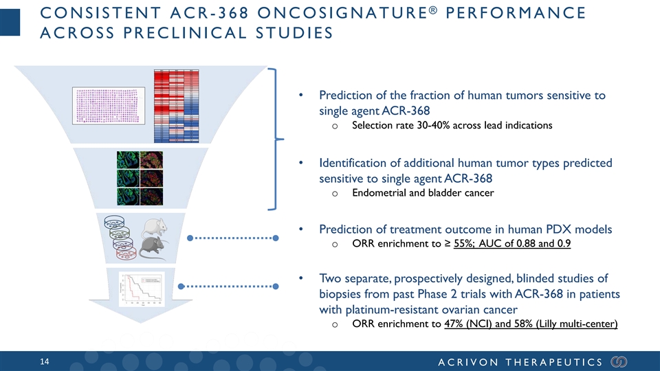 ® ONCOSIGNATURE TESTS: USAGE IN THE CLINIC Pretreatment Treatment decision tumor biopsy based on patient stratification Predicted Predicted Sample processing Responder Non-responder ® OncoSignature test Biopsy in Automated tumor FFPE Region-of-Interest block biomarker scoring • Pretreatment tumor biopsy test • Compatible with 5 business days turn-around • Offered by CDx partner under exclusive license from Acrivon 13 ACRIVON THERAPEUTICS