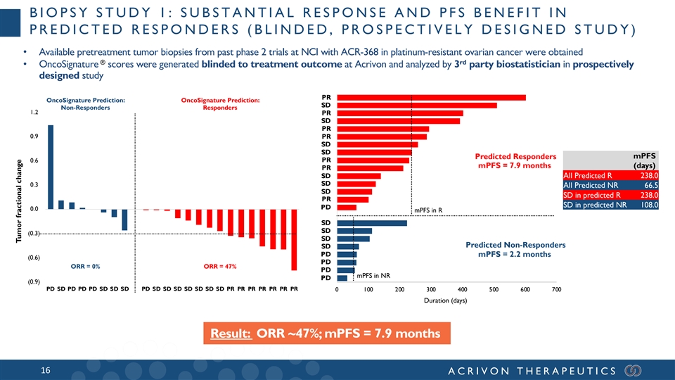 BIOPSY STUDY 1: SUBSTANTIAL RESPONSE AND PFS BENEFIT IN PREDICTED RESPONDERS (BLINDED, PROSPECTIVELY DESIGNED STUDY) • Available pretreatment tumor biopsies from past phase 2 trials at NCI with ACR-368 in platinum-resistant ovarian cancer were obtained ® rd • OncoSignature scores were generated blinded to treatment outcome at Acrivon and analyzed by 3 party biostatistician in prospectively designed study PR OncoSignature Prediction: OncoSignature Prediction: SD Non-Responders Responders 1.2 PR SD PR 0.9 PR SD SD mPFS Predicted Responders 0.6 PR mPFS = 7.9 months (days) PR SD All Predicted R 238.0 SD 0.3 All Predicted NR 66.5 SD SD in predicted R 238.0 PR SD in predicted NR 108.0 PD 0.0 mPFS in R SD SD (0.3) SD Predicted Non-Responders SD PD mPFS = 2.2 months (0.6) PD ORR = 0% ORR = 47% PD mPFS in NR PD (0.9) PD SD PD PD PD SD SD SD PD SD SD SD SD SD SD SD PR PR PR PR PR PR PR 0 100 200 300 400 500 600 700 Duration (days) Result: ORR ~47%; mPFS = 7.9 months 16 ACRIVON THERAPEUTICS Tumor fractional change