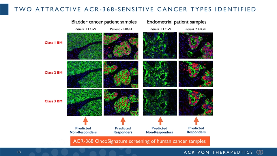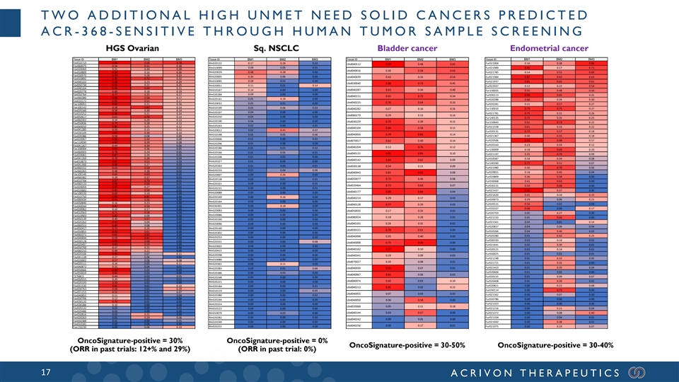 TWO ADDITIONAL HIGH UNMET NEED SOLID CANCERS PREDICTED ACR -368 -SENSITIVE THROUGH HUMAN TUMOR SAMPLE SCREENING HGS Ovarian Sq. NSCLC Bladder cancer Endometrial cancer Tissue ID BM1 BM2 BM3 Tissue ID BM1 BM2 BM3 Tissue ID BM1 BM2 BM3 Tissue ID BM1 BM2 BM3 Fov010719 0.96 0.68 0.78 Rln020132 0.17 0.26 0.02 Fur021904 0.16 0.38 0.86 Ubd040512 0.99 0.48 0.65 Fov060075 0.54 0.51 0.38 Rln010099 0.08 0.06 0.01 Fur021989 0.86 0.17 0.71 Fov020069 0.31 0.30 0.38 Ubd040016 0.30 0.58 0.63 Fov010809 0.94 0.16 0.36 Rln020029 0.48 0.28 0.00 Fur021785 0.14 0.55 0.69 Fov030970 0.93 0.28 0.33 Rln020005 0.34 0.06 0.00 Ubd040039 0.43 0.33 0.54 Fur021984 0.87 0.62 0.63 Fov010892 0.95 0.72 0.32 Rln010095 0.28 0.02 0.00 Fov040102 0.98 0.23 0.29 Fur021937 0.81 0.65 0.61 Ubd030040 0.88 0.73 0.45 Fov050734 0.95 0.22 0.25 Rln020051 0.11 0.01 0.14 Fur022037 0.12 0.22 0.54 Fov040164 0.94 0.69 0.21 Ubd040287 0.63 0.34 0.40 Rln010167 0.14 0.00 0.00 Fur130035 0.55 0.48 0.50 Fov020776 0.60 0.18 0.19 Fov050764 0.77 0.35 0.17 Rln020284 0.09 0.00 0.00 Fur030113 0.90 0.65 0.31 Ubd040151 0.65 0.72 0.34 Fov060380 0.98 0.58 0.17 Rln020141 0.05 0.18 0.00 Fur020288 0.60 0.26 0.30 Fov010172 0.85 0.51 0.17 Ubd040225 0.76 0.64 0.33 Rln020032 0.05 0.01 0.00 Fov100051 0.92 0.21 0.16 Fur020281 0.21 0.57 0.27 Fov100142 0.58 0.82 0.14 Rln010199 0.05 0.06 0.03 Fur130010 0.79 0.75 0.27 Ubd040282 0.27 0.16 0.26 Fov020160 0.58 0.30 0.14 Rln020197 0.04 0.00 0.00 Fur021781 0.75 0.31 0.26 Fov010252 0.96 0.21 0.14 Ubd060279 0.29 0.13 0.16 Fov050617 0.61 0.76 0.14 Rln020250 0.04 0.00 0.00 Fur140135 0.72 0.35 0.25 Fov060302 0.24 0.29 0.13 Rln020190 0.04 0.00 0.00 Ubd030229 0.79 0.39 0.15 Fur150643 0.61 0.73 0.22 Fov050836 0.79 0.28 0.13 0.02 0.00 0.01 Fov060050 0.86 0.25 0.12 Rln020243 Fur021558 0.61 0.33 0.22 Ubd040104 0.84 0.58 0.15 Fov041285 0.50 0.15 0.11 Rln020012 0.02 0.41 0.07 Fur020131 0.73 0.57 0.18 Fov030109 0.97 0.39 0.10 Rln010148 0.02 0.05 0.06 Ubd040056 0.79 0.83 0.14 Fov020386 0.58 0.08 0.09 Fur021367 0.30 0.55 0.18 Fov020067 0.96 0.44 0.08 Rln020006 0.01 0.00 0.02 Ubd070017 0.62 0.40 0.14 Fur020506 0.94 0.68 0.17 Fov110030 0.92 0.39 0.08 Rln020296 0.01 0.00 0.00 Fur020163 0.23 0.33 0.12 Fov041267 0.44 0.39 0.06 Ubd040204 0.12 0.76 0.12 Rln020186 0.01 0.02 0.02 Fov100004 0.95 0.36 0.05 Fur130009 0.18 0.69 0.10 Fov060003 0.78 0.24 0.05 Rln020166 0.01 0.05 0.01 Ubd040131 0.95 0.81 0.10 Fur021197 0.35 0.70 0.09 Fov020061 0.87 0.20 0.05 Rln020208 0.01 0.01 0.00 Fov041269 0.70 0.38 0.04 Fur010587 0.18 0.34 0.08 Ubd040142 0.84 0.62 0.09 Fov010873 0.97 0.53 0.03 Rln020327 0.01 0.00 0.00 Fur140260 0.77 0.51 0.07 Fov041300 0.90 0.27 0.03 Rln020343 0.01 0.00 0.01 Ubd030138 0.54 0.11 0.09 Fov060152 0.63 0.59 0.02 Fur021980 0.30 0.70 0.06 Rln020233 0.01 0.04 0.06 Fov060265 0.48 0.38 0.02 Ubd040043 0.65 0.92 0.08 Fur020831 0.18 0.45 0.04 Fov100146 0.66 0.63 0.01 0.00 0.26 0.00 Rln020007 Fov060382 0.28 0.37 0.01 Fur020809 0.36 0.58 0.00 Rln020138 0.00 0.01 0.01 Ubd050077 0.72 0.46 0.08 Fov010706 0.87 0.70 0.01 Fur030068 0.41 0.63 0.00 Fov060133 0.93 0.69 0.01 Rln020321 0.00 0.00 0.01 Ubd020464 0.73 0.63 0.07 Fur030131 0.50 0.68 0.00 Fov020059 0.97 0.27 0.01 Rln020231 0.00 0.00 0.01 Fov010682 0.85 0.59 0.01 Fur021437 0.98 0.37 0.00 Ubd040177 0.89 0.84 0.04 Rln020088 0.00 0.00 0.00 Fov100220 0.69 0.18 0.00 Fur021620 0.41 0.10 0.33 Fov010750 0.98 0.81 0.00 Rln020169 0.00 0.16 0.00 Ubd040214 0.29 0.17 0.03 Fov060434 0.91 0.56 0.00 Fur020073 0.29 0.06 0.21 Rln020164 0.00 0.00 0.00 Fov050840 0.16 0.23 0.00 Fur020115 0.56 0.02 0.00 Ubd040128 0.77 0.29 0.03 Fov040044 0.81 0.54 0.00 Rln030301 0.00 0.18 0.00 Fur020107 0.68 0.00 0.17 Fov030062 0.10 0.17 0.00 Rln020083 0.00 0.00 0.00 Ubd050035 0.17 0.33 0.02 Fov010563 0.71 0.58 0.00 Fur020703 0.05 0.27 0.00 Rln020086 0.00 0.00 0.00 Fov010903 0.82 0.09 0.00 Ubd080024 0.18 0.28 0.01 Fur021233 0.05 0.66 0.00 Fov050139 0.40 0.57 0.00 Rln020160 0.00 0.00 0.00 Fov020262 0.91 0.09 0.00 Fur021561 0.04 0.01 0.14 0.00 0.00 0.00 Ubd040101 0.26 0.31 0.01 Rln020096 Fov060553 0.84 0.08 0.00 Fur020837 0.04 0.06 0.04 Fov050417 0.72 0.26 0.00 Rln020140 0.00 0.00 0.00 Ubd030151 0.79 0.61 0.00 Fur020266 0.04 0.40 0.03 Fov050855 0.92 0.61 0.00 Rln020302 0.00 0.00 0.00 Fov060371 0.81 0.82 0.00 Fur020280 0.03 0.42 0.25 Ubd040098 0.35 0.40 0.00 Fov040694 0.59 0.81 0.00 Rln020253 0.00 0.00 0.00 Fur030193 0.03 0.10 0.02 Fov030128 0.99 0.68 0.00 Rln020331 0.00 0.00 0.08 Ubd040008 0.75 0.90 0.00 Fov020497 0.83 0.59 0.00 Fur021641 0.02 0.30 0.01 Rln020002 0.00 0.00 0.00 Fov050700 0.37 0.25 0.00 Ubd040162 0.97 0.10 0.00 Fur020121 0.02 0.14 0.01 Fov060210 0.48 0.22 0.00 Rln020415 0.00 0.00 0.00 Fov020106 0.95 0.07 0.11 Fur030025 0.01 0.03 0.01 Rln020298 0.00 0.00 0.00 Ubd040341 0.19 0.09 0.03 Fov041138 0.27 0.06 0.00 Fur021248 0.01 0.32 0.05 Rln010086 0.00 0.00 0.00 Fov020002 0.57 0.06 0.08 Ubd070027 0.20 0.08 0.01 Fur021721 0.01 0.35 0.00 Fov020111 0.16 0.05 0.11 Rln020361 0.00 0.11 0.00 Fov040872 0.31 0.04 0.01 Fur021423 0.01 0.35 0.04 Rln020383 0.00 0.01 0.06 Ubd040030 0.95 0.07 0.01 Fov050666 0.99 0.03 0.00 0.00 0.03 0.00 Fur020604 0.01 0.02 0.00 Fov050659 0.81 0.03 0.00 Rln020386 Ubd040067 0.81 0.06 0.03 71768C3 0.44 0.03 0.05 Fur020155 0.01 0.09 0.07 Rln020248 0.00 0.00 0.00 Fov050555 0.20 0.02 0.01 Ubd040074 0.60 0.03 0.10 Fur020408 0.01 0.39 0.02 Rln020221 0.00 0.00 0.00 Fov020193 0.69 0.02 0.00 Fov031530 0.81 0.01 0.10 Fur020821 0.00 0.22 0.08 Rln020184 0.00 0.00 0.01 Ubd040213 0.85 0.02 0.15 Fov030763 0.59 0.01 0.29 Rln010119 0.00 0.00 0.05 Fur030114 0.00 0.73 0.00 Fov021215 0.52 0.01 0.07 Ubd040055 0.07 0.03 0.02 Fov040855 0.11 0.01 0.04 Rln020380 0.00 0.00 0.02 Fur021562 0.00 0.07 0.00 Fov050706 0.12 0.01 0.00 Fur020786 0.00 0.00 0.00 Rln020244 0.00 0.00 0.00 Ubd040050 0.06 0.58 0.00 Fov030120 0.70 0.01 0.00 Fur021353 0.00 0.00 0.00 Fov030286 0.10 0.00 0.00 Rln020324 0.00 0.00 0.00 Ubd020068 0.05 0.11 0.18 Fov020132 0.03 0.00 0.01 Rln010122 0.00 0.00 0.00 Fur021216 0.00 0.21 0.04 Fov020486 0.03 0.00 0.00 Rln010079 0.00 0.03 0