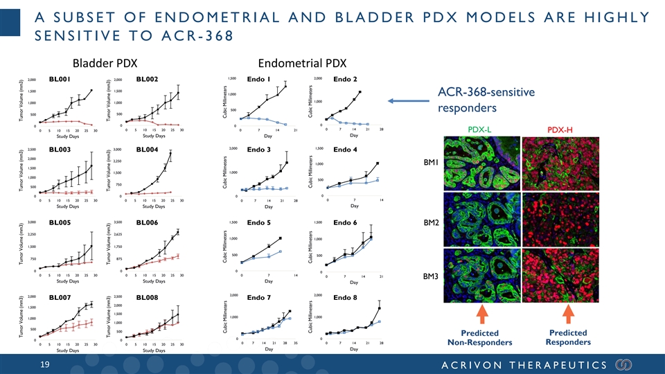 TWO ATTRACTIVE ACR -368 -SENSITIVE CANCER TYPES IDENTIFIED Bladder cancer patient samples Endometrial patient samples Pa Pti ae tint 1 L ent 1 O LO W W P Pa at tiie ent nt 2 H 2 HIG IGH H PP aa tite ient 1 L nt 1-LO OW W P Paatti ieent nt 2 H 2-HIG IG H H Class 1 BM Class 1 BM CHK1 S296 Class 2 BM Class 2 BM KAP1 S473 Class 3 BM Class 3 BM CCNE1 Predicted Predicted Predicted Predicted Non-Responders Responders Non-Responders Responders ACR-368 OncoSignature screening of human cancer samples 18 ACRIVON THERAPEUTICS